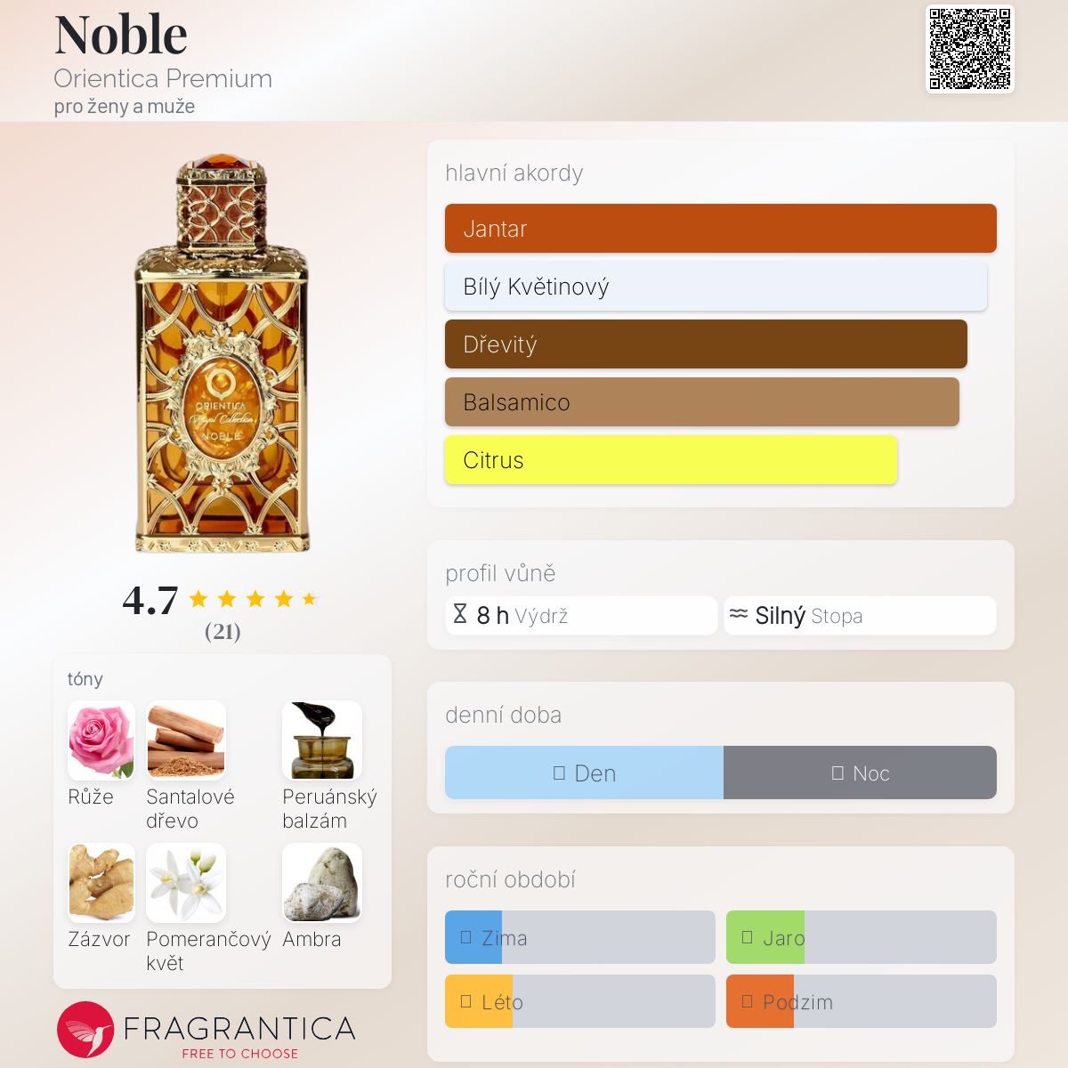 Noble podle Orientica Premium je vůně pro ženy a muže. Toto je nová vůně. Noble byl/a uveden/a v roce 2025. Vrchní tóny jsou Zázvor, Mandarinka a Hruška; střední tóny jsouRůže, Pomerančový květ a Jasmín ; základní tóny jsou Santalové dřevo, Peruánský balzám a Ambra.