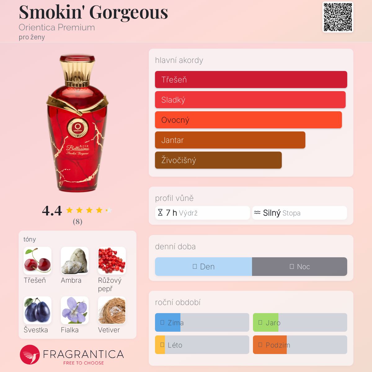 Smokin' Gorgeous podle Orientica Premium je Floral Fruity vůně pro ženy. Toto je nová vůně. Smokin' Gorgeous byl/a uveden/a v roce 2024. Vrchní tóny jsou Třešeň, Růžový pepř, Švestka, Zázvor a Černý rybíz; střední tóny jsouFialka, Jasmín, Růže a Konvalinka ; základní tóny jsou Ambra, Vetiver, Maliny a Pižmo.
