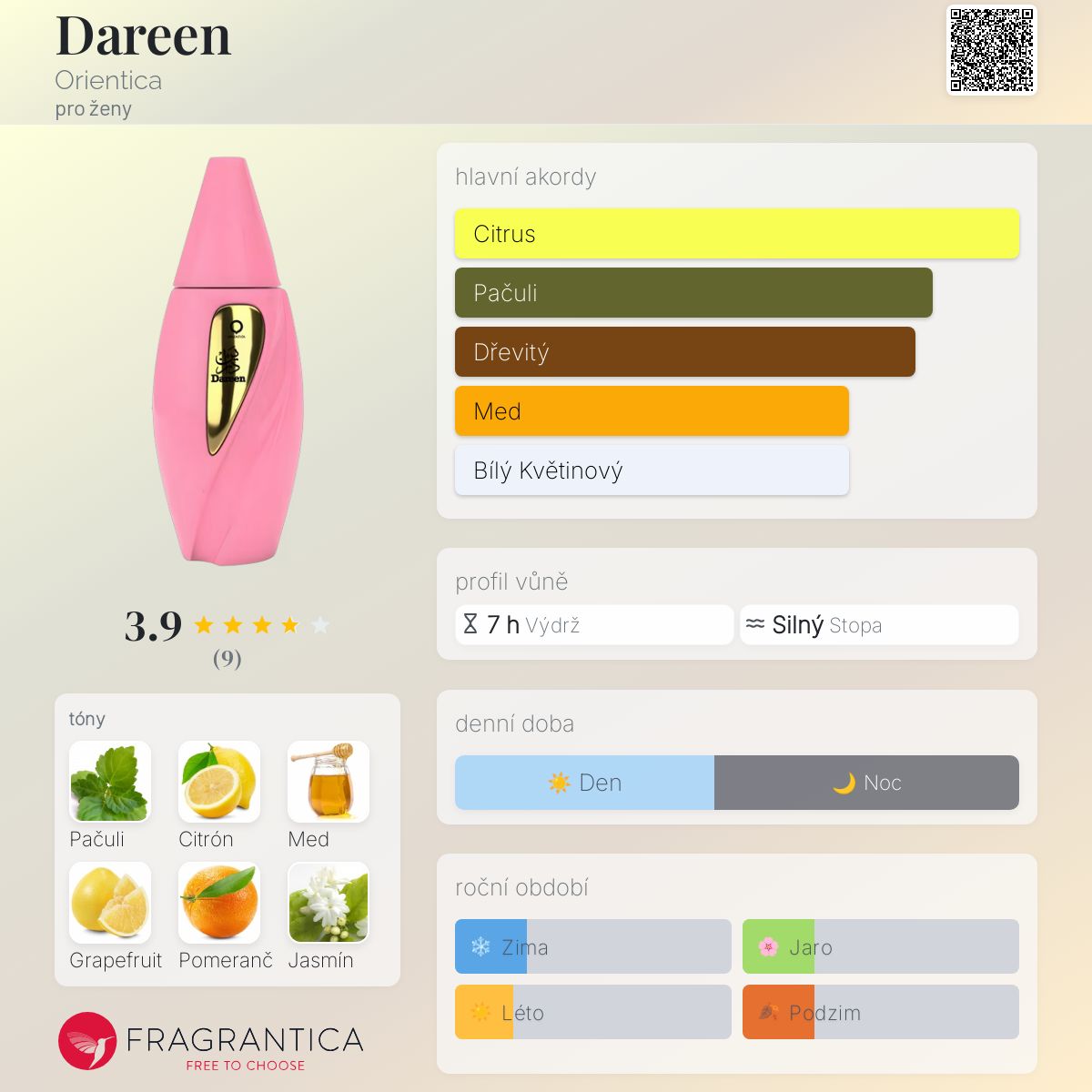 Dareen podle Orientica je Floral Fruity Gourmand vůně pro ženy. Dareen byl/a uveden/a v roce 2018. Vrchní tóny jsou Citrón, Grapefruit a Pomeranč; střední tóny jsouPačuli, Med, Jasmín a Konvalinka ; základní tóny jsou Vanilka a Santalové dřevo.
