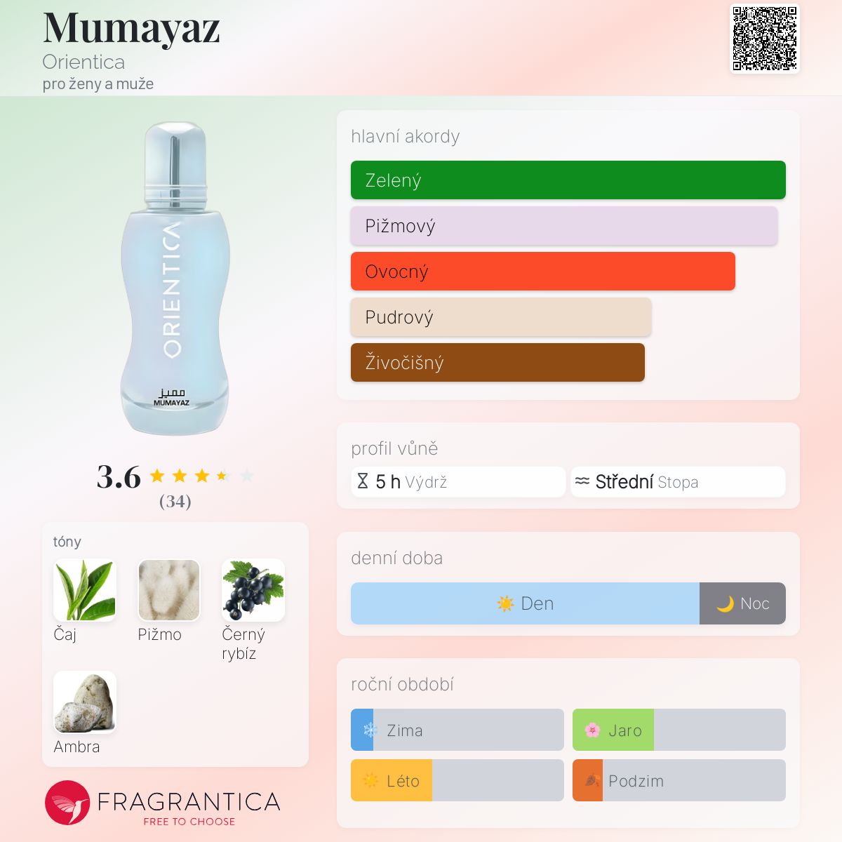 Mumayaz podle Orientica je Aromatic Green vůně pro ženy a muže. Mumayaz byl/a uveden/a v roce 2018. Vrchní tóny jsou Zelený čaj a Černý rybíz; střední tón jeČerný čaj ; základní tóny jsou Pižmo a Ambra.