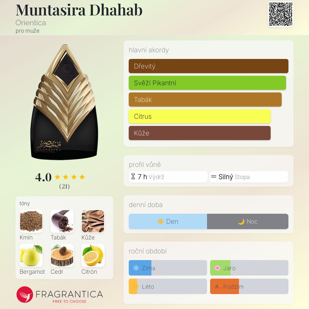 Muntasira Dhahab podle Orientica je Leather vůně pro muže. Muntasira Dhahab byl/a uveden/a v roce 2018. Vrchní tóny jsou Kmín, Bergamot a Citrón; střední tóny jsouKůže, Cedr a Santalové dřevo ; základní tóny jsou Tabák a Pačuli.