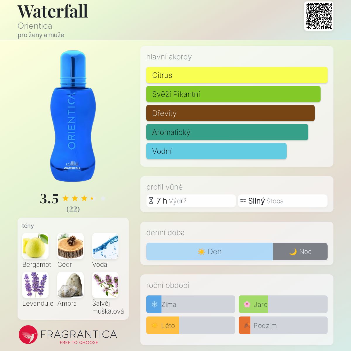 Waterfall podle Orientica je Aromatic Aquatic vůně pro ženy a muže. Waterfall byl/a uveden/a v roce 2018. Vrchní tóny jsou Bergamot, Vodní tóny, Šalvěj muškátová a Zelené jablko; střední tóny jsouLevandule, Muškátový oříšek, Pomerančový květ a Pelargónie ; základní tóny jsou Cedr, Ambra, Pižmo a Mech.