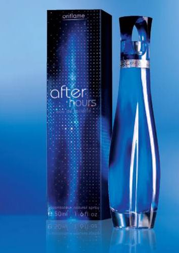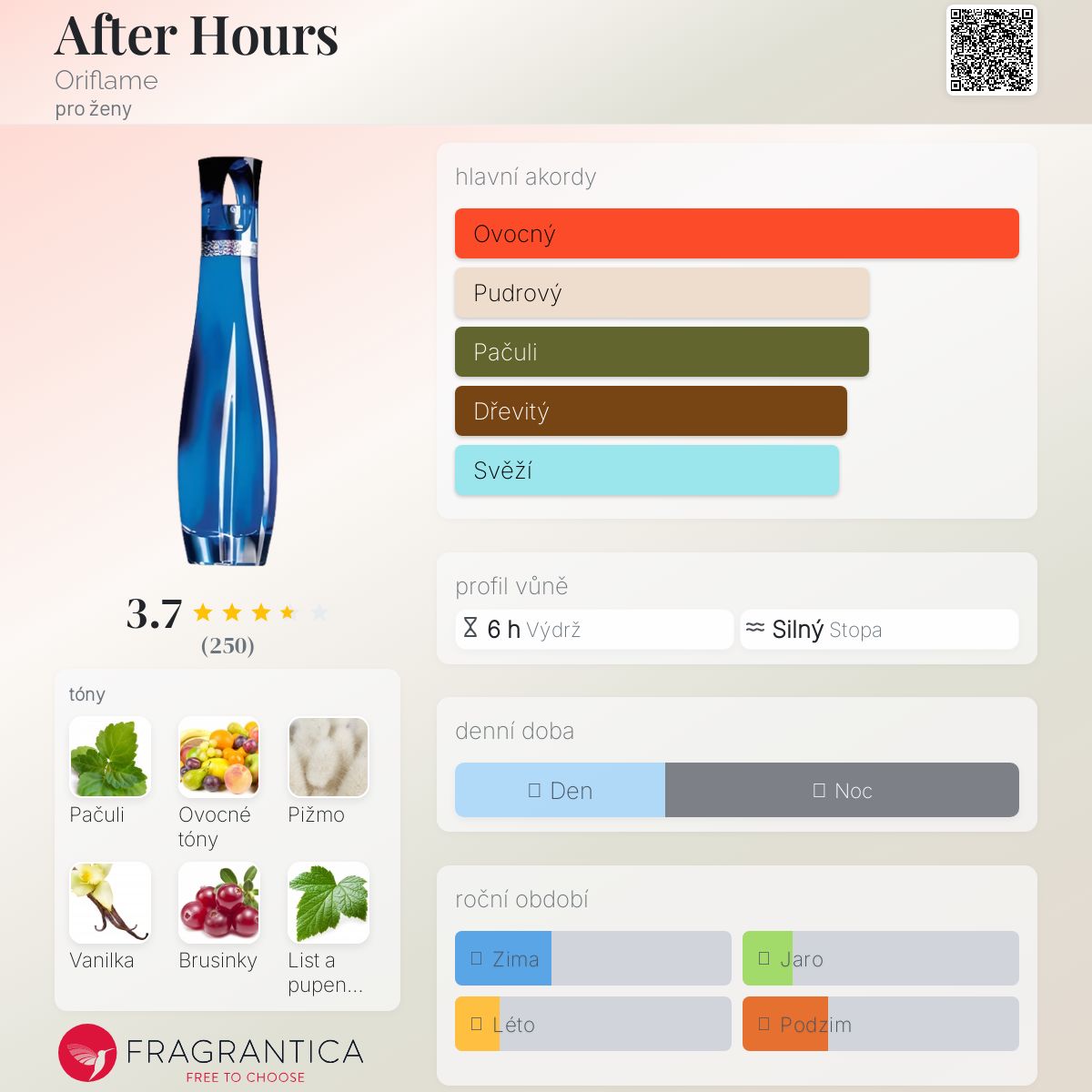 After Hours podle Oriflame je Floral Fruity vůně pro ženy. After Hours byl/a uveden/a v roce 2008. "Nosem" za touto vůní je Bernard Ellena. Vrchní tóny jsou Ovocné tóny, Brusinky a Černý rybíz; střední tóny jsouPivoňka, Fialka a Jasmín ; základní tóny jsou Pačuli, Pižmo a Vanilka.