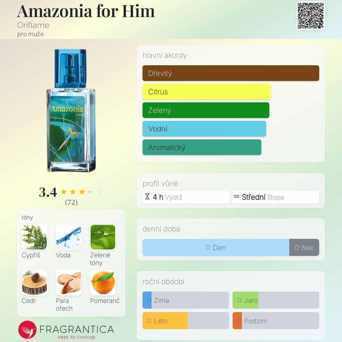 Amazonia for Him podle Oriflame je Woody Aquatic vůně pro muže. Amazonia for Him byl/a uveden/a v roce 2012. "Nosem" za touto vůní je Alexis Dadier. Vrchní tóny jsou Pomeranč, Mandarinka a Paulinie nápojná; střední tóny jsouCypřiš, Vodní tóny, Zelené tóny a Cedr ; základní tóny jsou Para ořech, Dubový mech a Jantar (ambra).