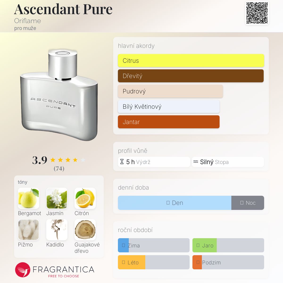 Ascendant Pure podle Oriflame je Woody Floral Musk vůně pro muže. Ascendant Pure byl/a uveden/a v roce 2010. "Nosem" za touto vůní je Christianne Plos. Vrchní tóny jsou Bergamot, Citron amalfi a Červené jablko; střední tóny jsouJasmín, Pižmo a Guajakové dřevo ; základní tóny jsou Kadidlo, Santalové dřevo, Cedr a Jantar (ambra).
