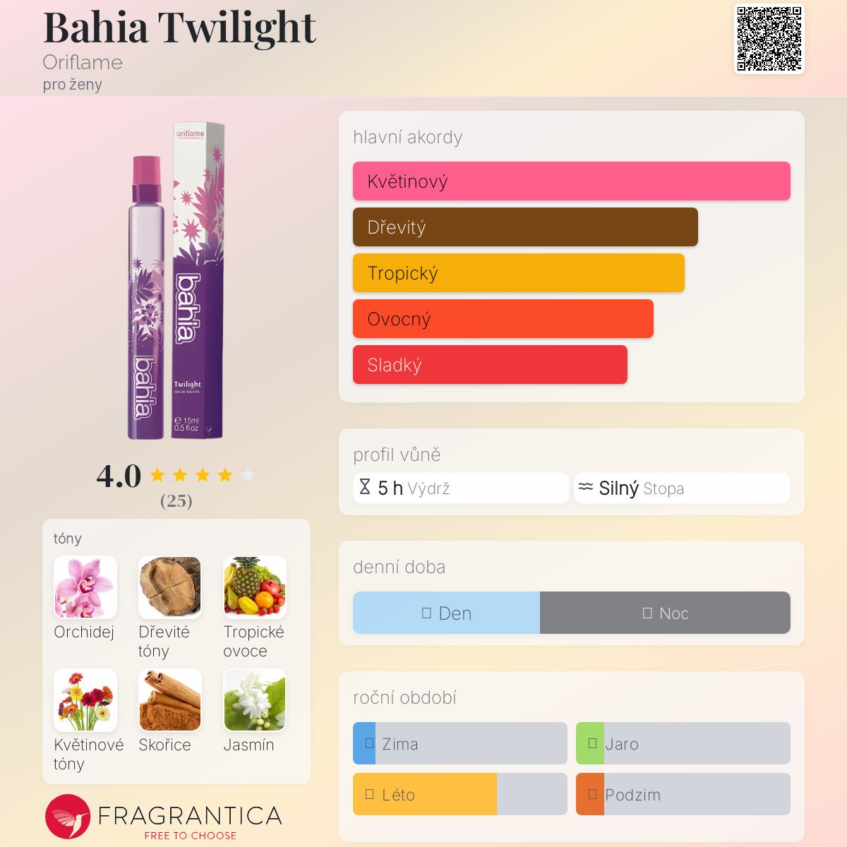 Bahia Twilight podle Oriflame je Floral Fruity vůně pro ženy. Bahia Twilight byl/a uveden/a v roce 2007. Vrchní tóny jsou Tropické ovoce a Skořice; střední tóny jsouVanilková orchidej, Exotické květinové tóny a Jasmín ; základní tón je Dřevité tóny.