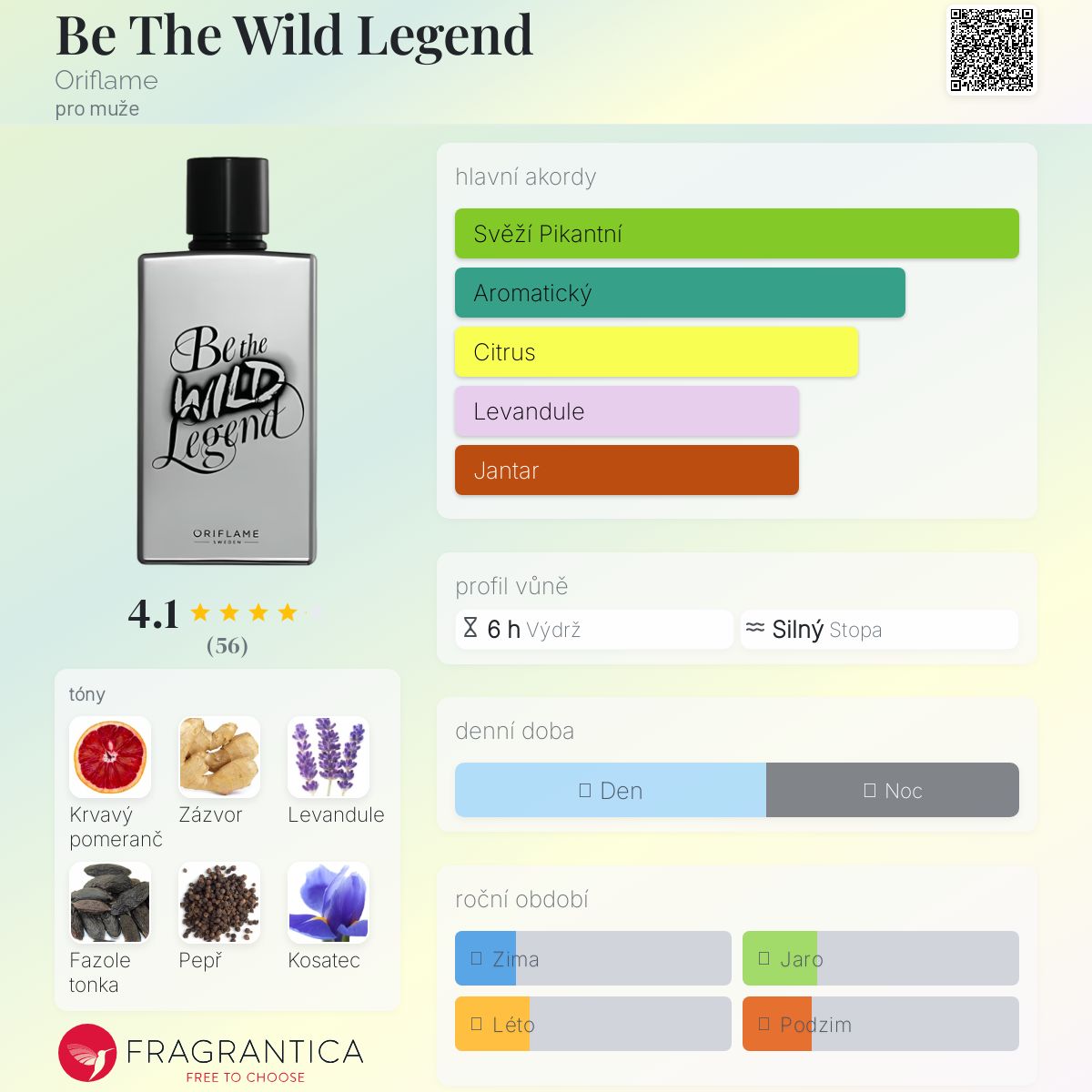 Be The Wild Legend podle Oriflame je Orientální Spicy vůně pro muže. Be The Wild Legend byl/a uveden/a v roce 2019. Vrchní tóny jsou Krvavý pomeranč, Zázvor a Černý pepř; střední tóny jsouLevandule, Kosatec a Pelargónie ; základní tóny jsou Fazole tonka, Vetiver a Ambra.