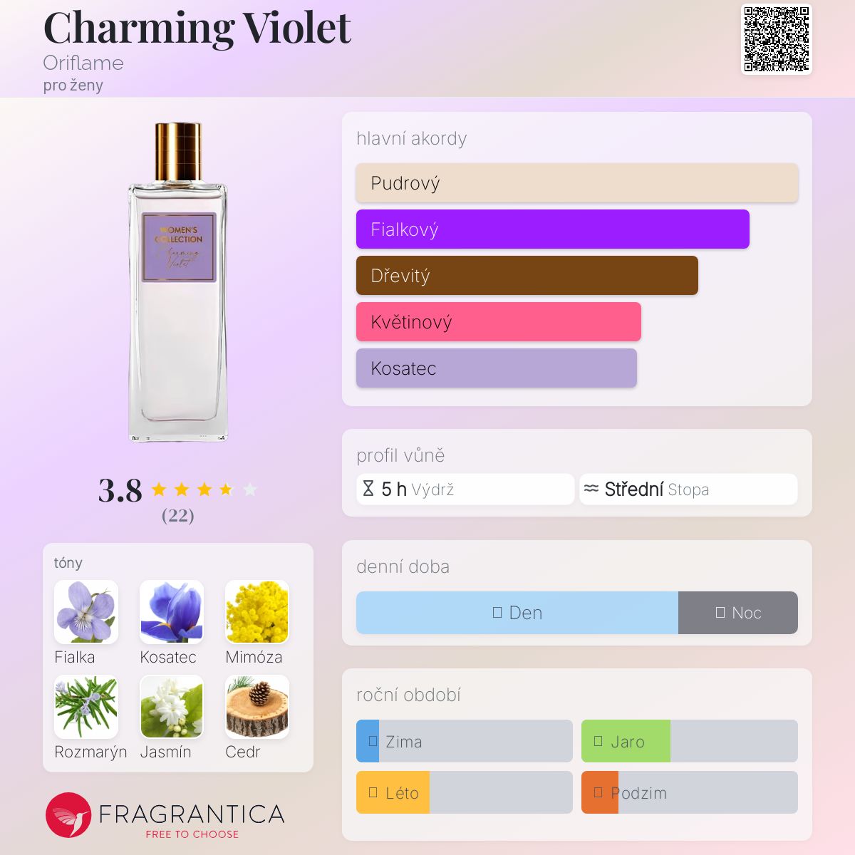 Charming Violet podle Oriflame je Floral vůně pro ženy. Toto je nová vůně. Charming Violet byl/a uveden/a v roce 2024. Vrchní tóny jsou Rozmarýn, Fík a Italský citrón; střední tóny jsouFialka, Kosatec, Mimóza, Jasmín Sambac a Kůže ; základní tóny jsou Cedr, Ambrostar™ a Bílé pižmo.