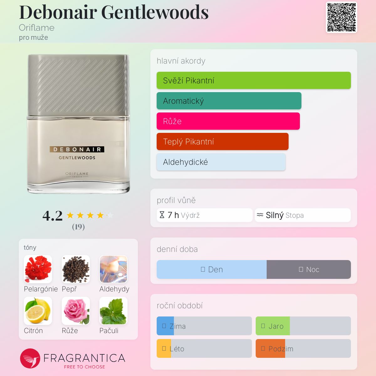 Debonair Gentlewoods podle Oriflame je Woody Aromatic vůně pro muže. Debonair Gentlewoods byl/a uveden/a v roce 2023. Vrchní tóny jsou Černý pepř, Aldehydy a Citrón; střední tóny jsouPelargónie, Růže a Šalvěj muškátová ; základní tóny jsou Pačuli, Bříza a Cedr.