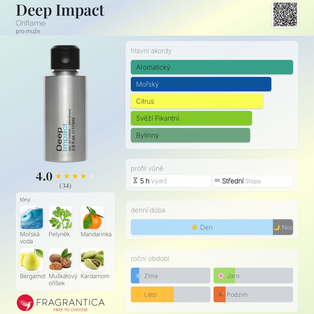 Deep Impact podle Oriflame je Aromatic Fougere vůně pro muže. Deep Impact byl/a uveden/a v roce 2009. Deep Impact byl/a vytvořen/a Bernard Ellena a Nathalie Feisthauer. Vrchní tóny jsou Pelyněk, Mandarinka a Bergamot; střední tóny jsouMořské tóny, Muškátový oříšek a Kardamom ; základní tóny jsou Fazole tonka, Pižmo a Jantar (ambra).