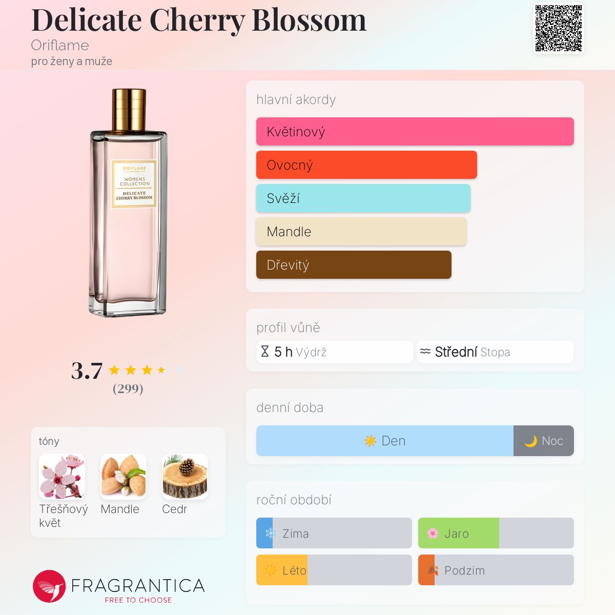 Delicate Cherry Blossom podle Oriflame je Floral vůně pro ženy a muže. Delicate Cherry Blossom byl/a uveden/a v roce 2016. Delicate Cherry Blossom byl/a vytvořen/a Marie Salamagne a Nathalie Lorson. Vrchní tón je Mandle ; střední tón jeTřešňový květ ; základní tón je Cedr.