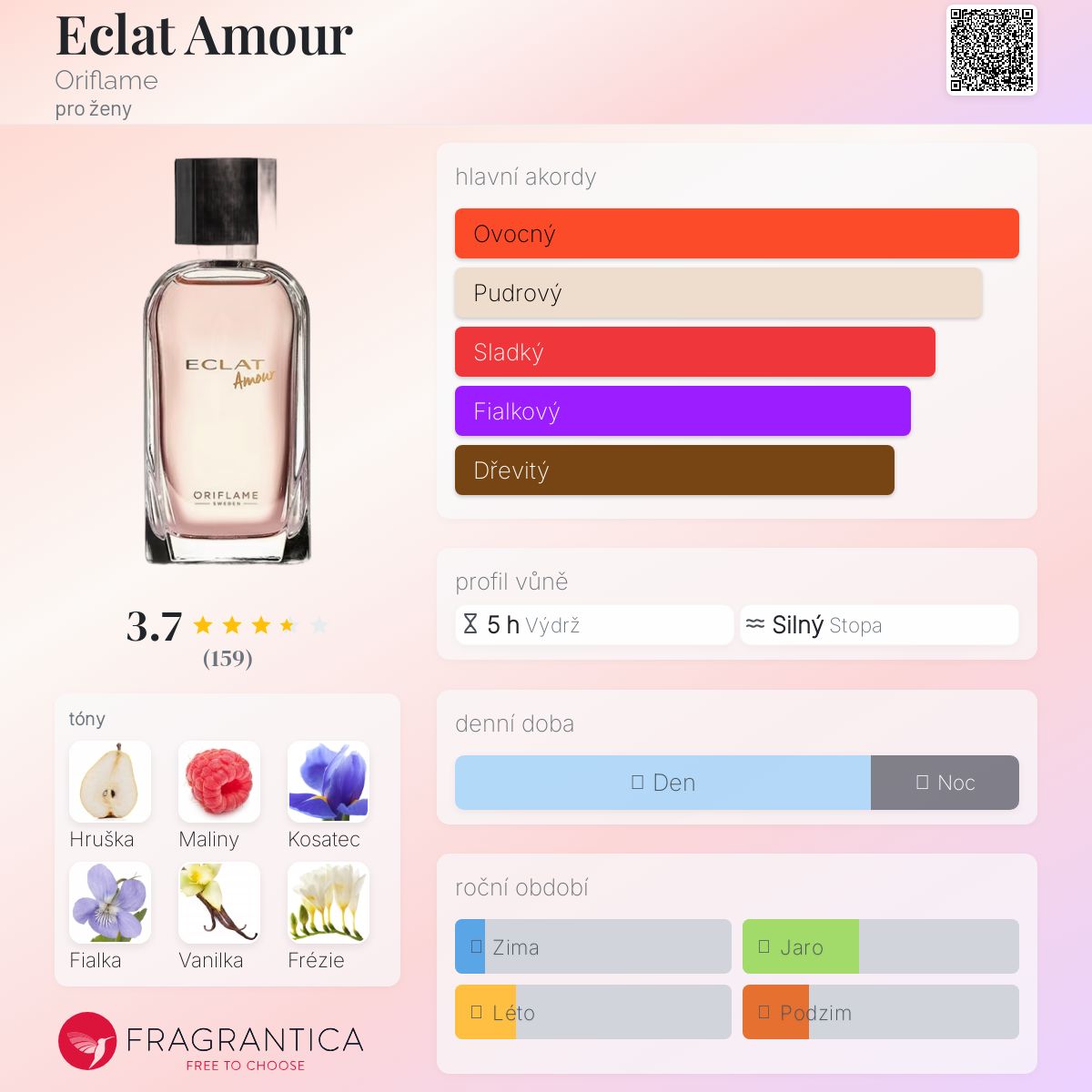 Eclat Amour podle Oriflame je Floral Woody Musk vůně pro ženy. Eclat Amour byl/a uveden/a v roce 2020. "Nosem" za touto vůní je Pierre Negrin. Vrchní tóny jsou Hruška, Bílá fialka a Frézie; střední tóny jsouMaliny, Bílý kosatec a Konvalinka ; základní tóny jsou Vanilka, Santalové dřevo a Cedr.