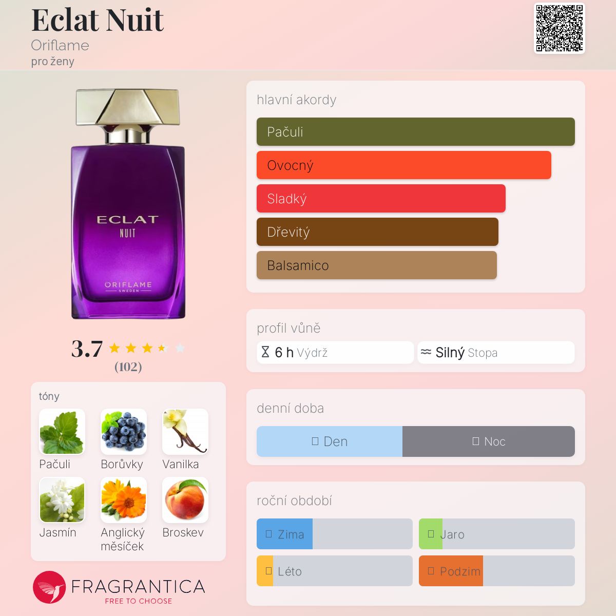 Eclat Nuit podle Oriflame je vůně pro ženy. Eclat Nuit byl/a uveden/a v roce 2021. Vrchní tóny jsou Borůvky, Měsíček a Broskev; střední tón jeJasmín ; základní tóny jsou Pačuli, Vanilka a Pižmo.