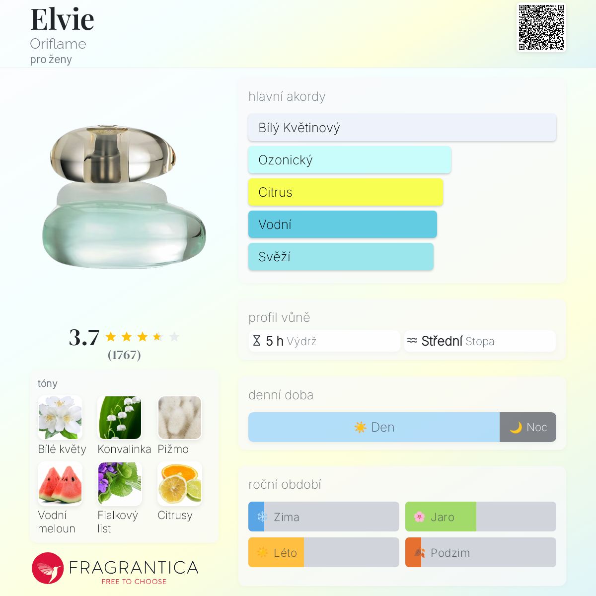 Elvie podle Oriflame je Floral Fruity vůně pro ženy. Elvie byla spuštěna během 2000. "Nosem" za touto vůní je Claude Chaubert. Vrchní tóny jsou Konvalinka, Vodní meloun, Citrusy, Frézie a Mandarinka; střední tóny jsouBílé květy, Fialkový list a Citronový květ ; základní tóny jsou Bílé pižmo, Palisandr, Santalové dřevo a Jantar (ambra).