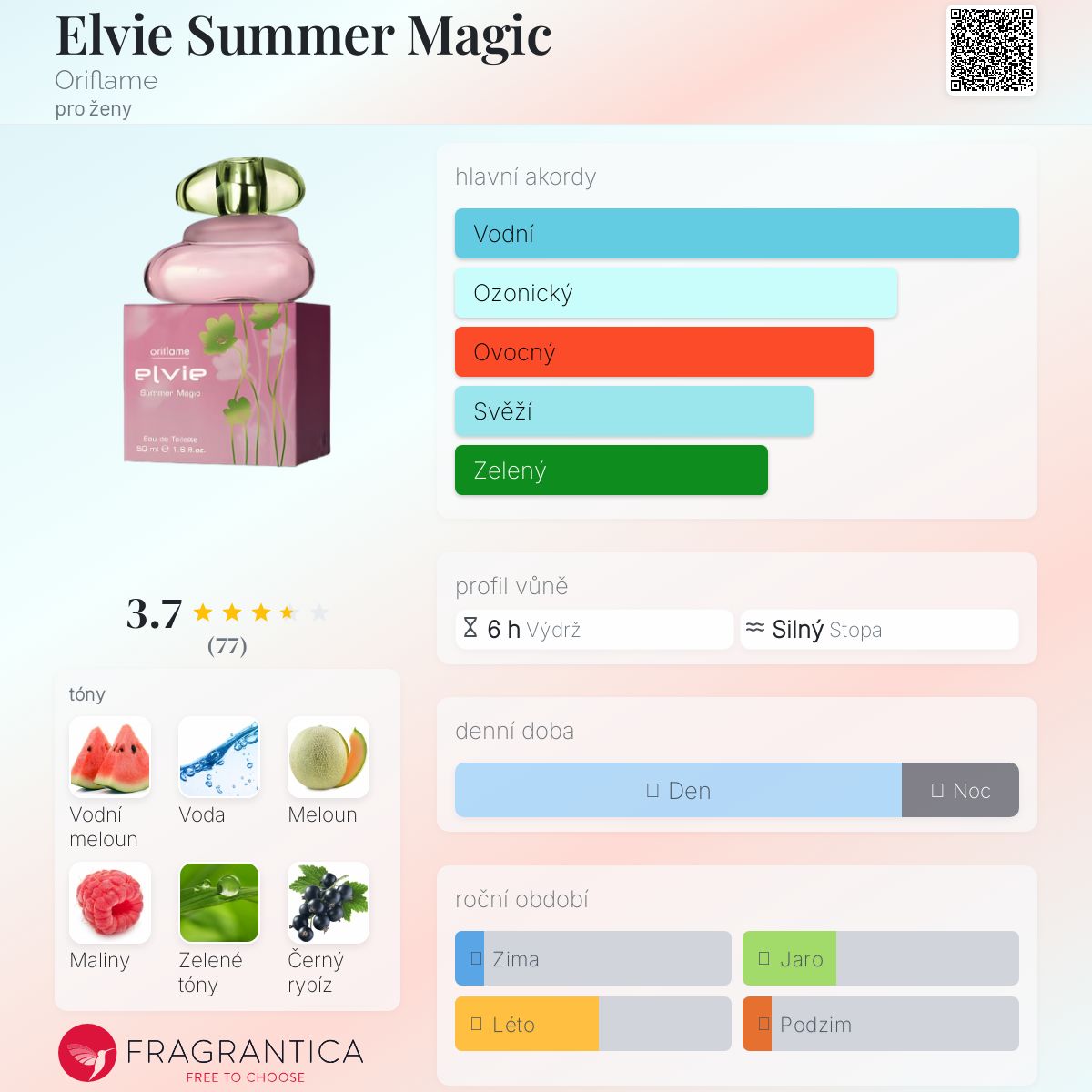Elvie Summer Magic podle Oriflame je Floral Fruity vůně pro ženy. Elvie Summer Magic byl/a uveden/a v roce 2007. Vrchní tóny jsou Vodní meloun, Meloun, Maliny, Černý rybíz, Mandarinka a Růžový pepř; střední tóny jsouVodní tóny, Zelené tóny, Fialka a Konvalinka ; základní tóny jsou Pižmo, Santalové dřevo a Jantar (ambra).