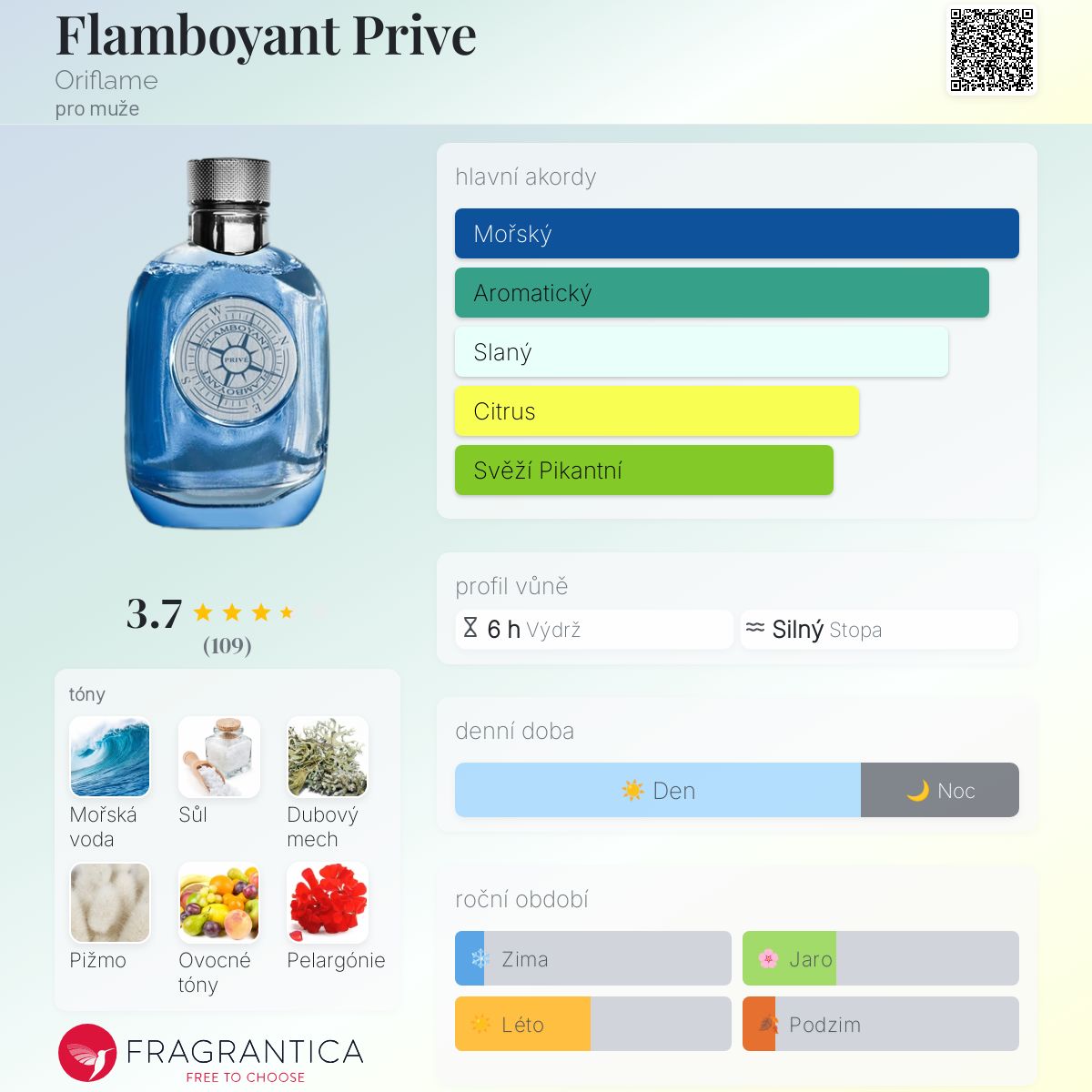 Flamboyant Prive podle Oriflame je Woody Aquatic vůně pro muže. Flamboyant Prive byl/a uveden/a v roce 2012. "Nosem" za touto vůní je Fabrice Pellegrin. Vrchní tóny jsou Ovocné tóny, Bergamot a Mandarinka; střední tóny jsouMořské tóny, Mořská sůl a Pelargónie ; základní tóny jsou Dubový mech, Pižmo a Vetiver.