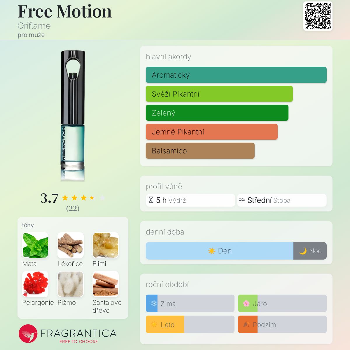 Free Motion podle Oriflame je Aromatic Aquatic vůně pro muže. Free Motion byl/a uveden/a v roce 2011. Vrchní tóny jsou Máta, Elimi a Citrón; střední tóny jsouLékořice, Pelargónie a Levandule ; základní tóny jsou Pižmo, Santalové dřevo a Pačuli.