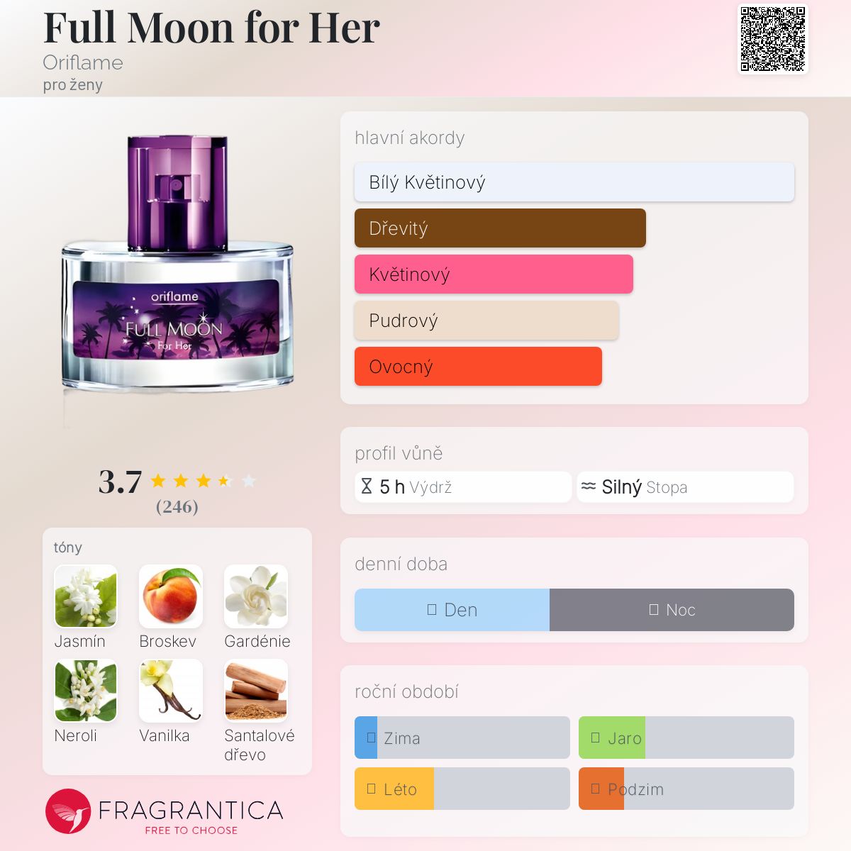 Full Moon for Her podle Oriflame je Floral Fruity vůně pro ženy. Full Moon for Her byl/a uveden/a v roce 2011. "Nosem" za touto vůní je Randa Hammami. Vrchní tóny jsou Broskev, Neroli a Bambus; střední tóny jsouJasmín, Gardénie a Brambořík ; základní tóny jsou Vanilka, Santalové dřevo, Jantar (ambra), Vanilková orchidej, Pačuli a Dubový mech.