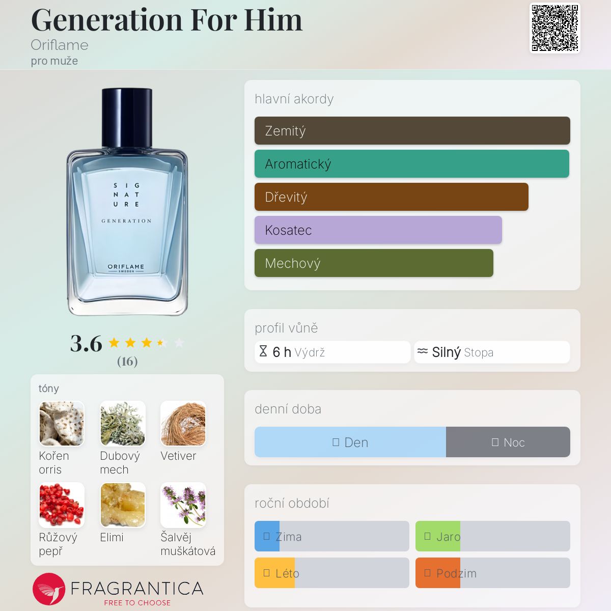 Generation For Him podle Oriflame je vůně pro muže. Toto je nová vůně. Generation For Him byl/a uveden/a v roce 2022. Generation For Him byl/a vytvořen/a Olivier Cresp a Sébastien Cresp. Vrchní tóny jsou Růžový pepř, Elimi a Citrón; střední tóny jsouKořen orris, Šalvěj muškátová a Rebarbora ; základní tóny jsou Dubový mech, Vetiver a Cedr.