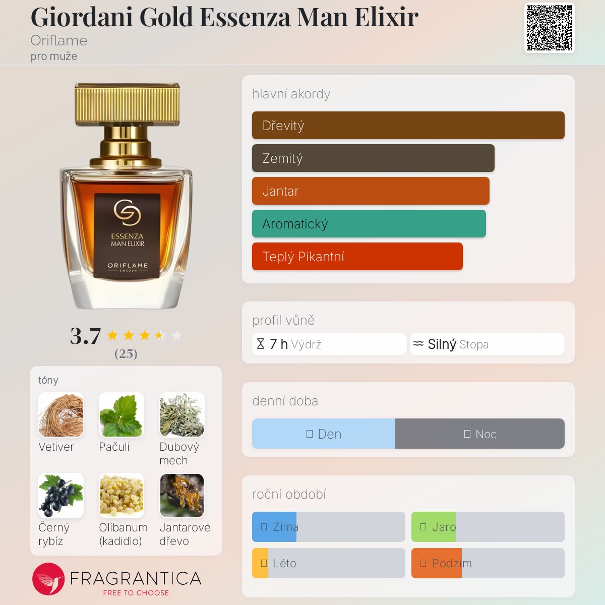 Giordani Gold Essenza Man Elixir podle Oriflame je Orientální vůně pro muže. Toto je nová vůně. Giordani Gold Essenza Man Elixir byl/a uveden/a v roce 2024. "Nosem" za touto vůní je Nathalie Lorson. Vrchní tóny jsou Černý rybíz, Černý pepř a Citrón; střední tóny jsouMech, Olibanum a Elimi ; základní tóny jsou Vetiver, Pačuli a Jantarové dřevo.