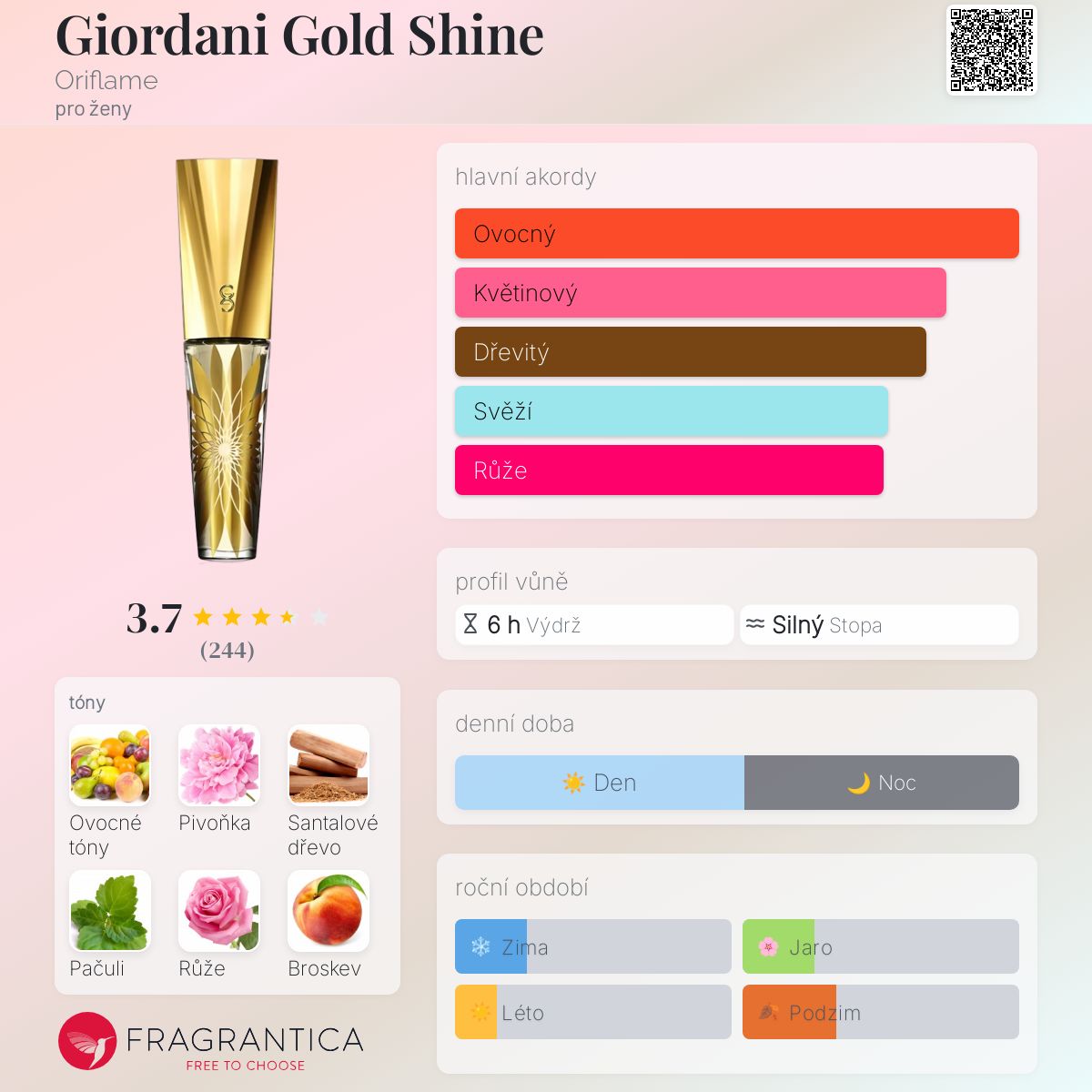Giordani Gold Shine podle Oriflame je Orientální Floral vůně pro ženy. Giordani Gold Shine byl/a uveden/a v roce 2010. Vrchní tóny jsou Ovocné tóny, Broskev a Mučenka; střední tóny jsouPivoňka, Tinktura z růže a Otočník ; základní tóny jsou Santalové dřevo a Pačuli.