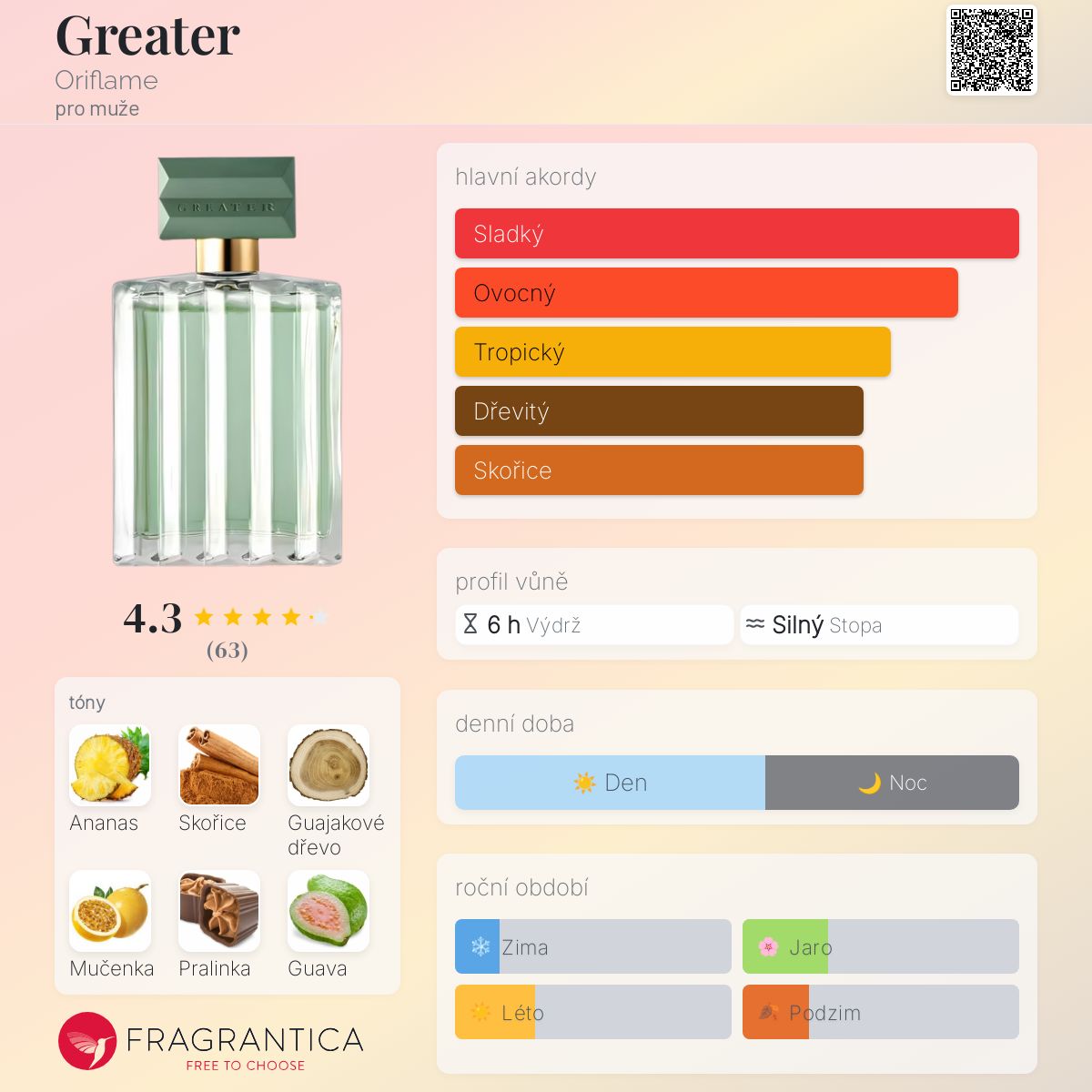 Greater podle Oriflame je Aromatic Fruity vůně pro muže. Greater byl/a uveden/a v roce 2023. Vrchní tóny jsou Ananas, Mučenka a Guava; střední tóny jsouSkořice, Pomerančový květ a Pelargónie ; základní tóny jsou Guajakové dřevo, Pralinka a Cedr.