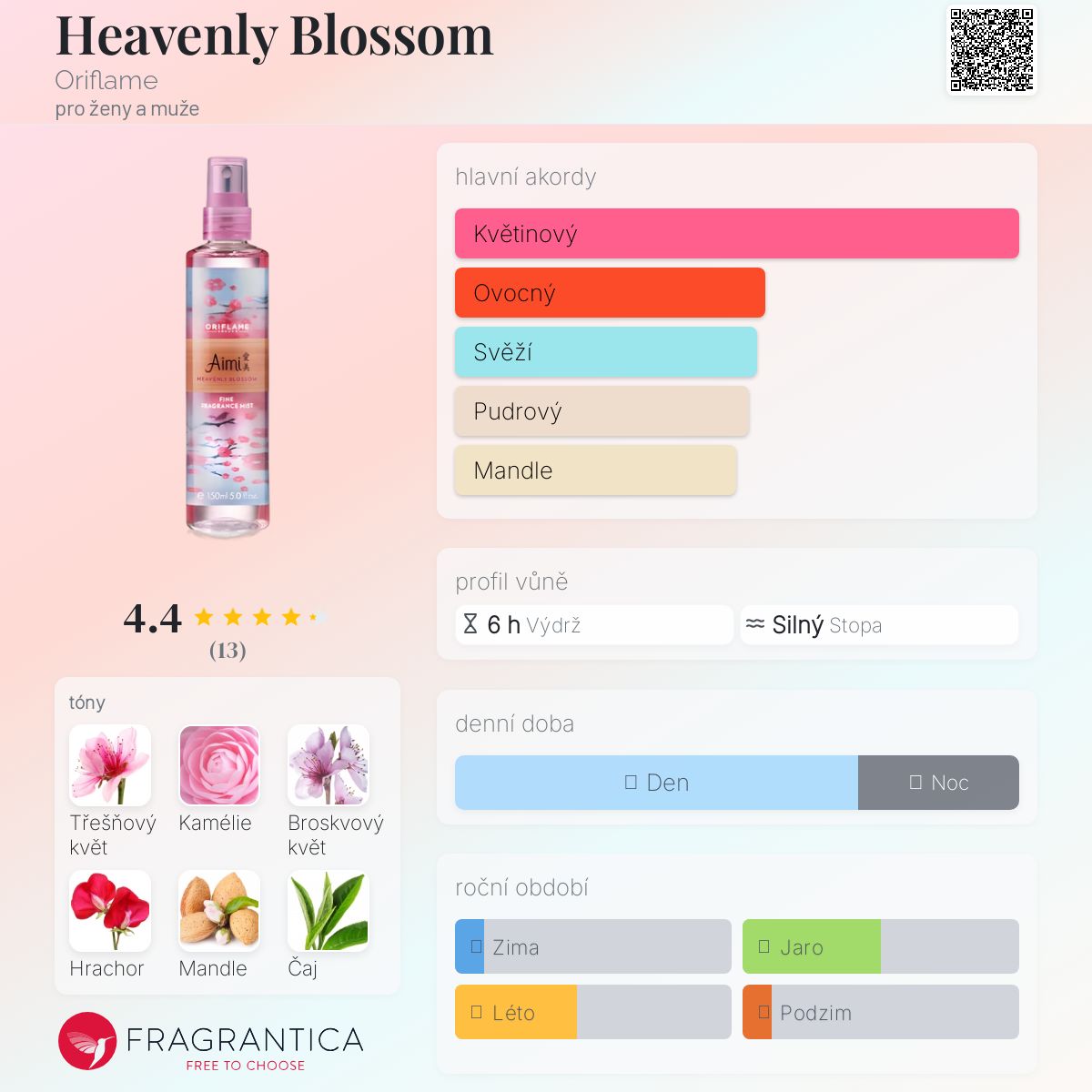 Heavenly Blossom podle Oriflame je vůně pro ženy a muže. Heavenly Blossom byl/a uveden/a v roce 2013. Vrchní tóny jsou Hrachor, Čaj, Květinové tóny a Ozonové tóny; střední tóny jsouTřešňový květ, Kamélie a Broskvový květ ; základní tóny jsou Zelená mandle, Pižmo a Santalové dřevo.