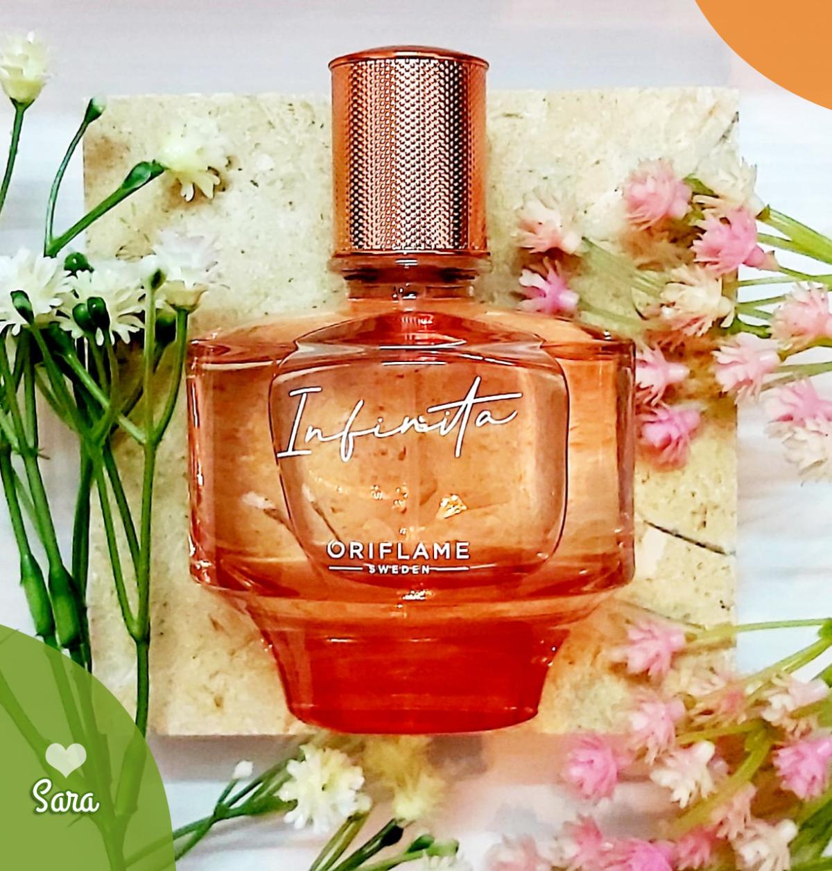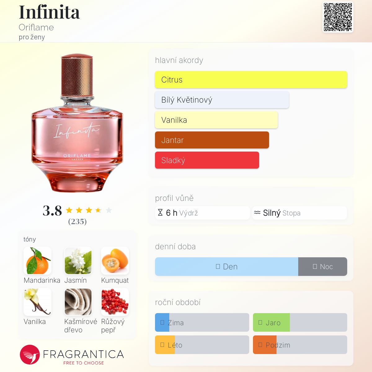 Infinita podle Oriflame je Floral vůně pro ženy. Infinita byl/a uveden/a v roce 2020. Vrchní tóny jsou Mandarinka, Kumquat a Růžový pepř; střední tón jeJasmín ; základní tóny jsou Vanilka, Kašmírové dřevo a Jantar (ambra).