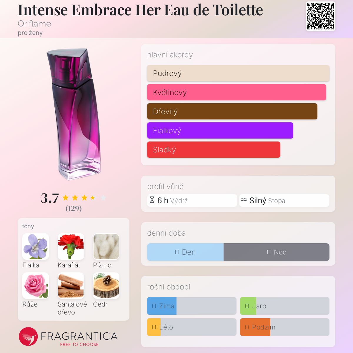 Intense Embrace Her Eau de Toilette podle Oriflame je Orientální Floral vůně pro ženy. Intense Embrace Her Eau de Toilette byl/a uveden/a v roce 2010. "Nosem" za touto vůní je Randa Hammami. Vrchní tóny jsou Fialka, Frézie a Červené jablko; střední tóny jsouKarafiát, Růže a Ylang-Ylang ; základní tóny jsou Pižmo, Santalové dřevo, Virginský cedr, Vanilka a Pralinka.