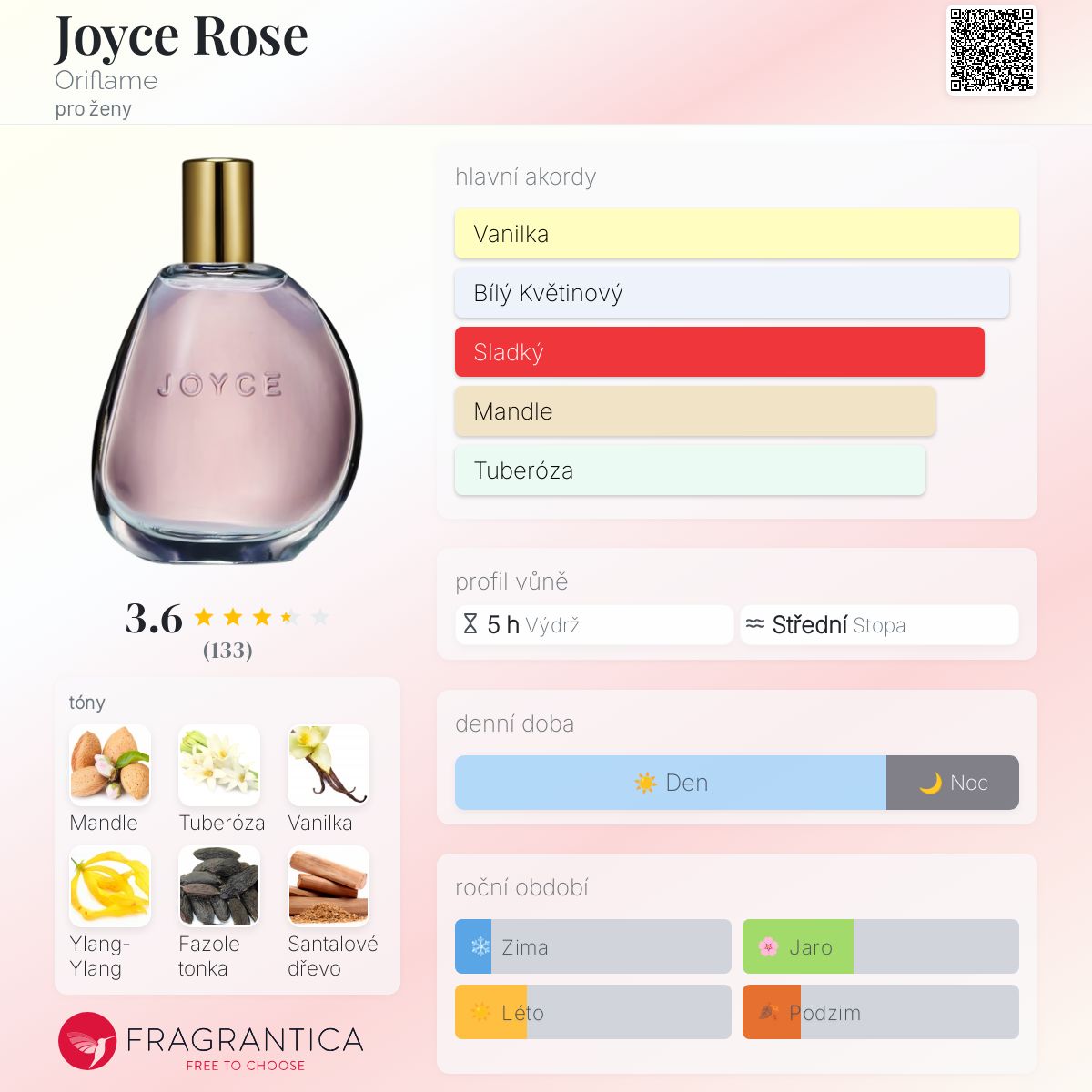 Joyce Rose podle Oriflame je Orientální Floral vůně pro ženy. Joyce Rose byl/a uveden/a v roce 2020. Vrchní tóny jsou Mandle, Citrón a Růžový pepř; střední tóny jsouTuberóza, Ylang-Ylang a Jasmín ; základní tóny jsou Vanilka, Fazole tonka a Santalové dřevo.
