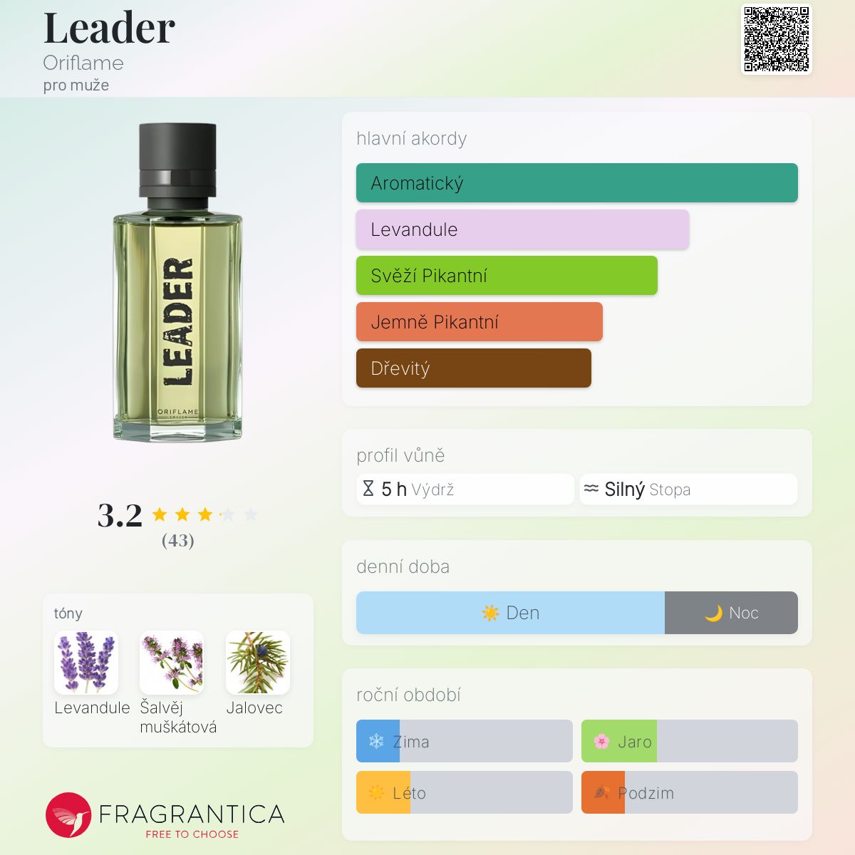 Leader podle Oriflame je Woody Aromatic vůně pro muže. Leader byl/a uveden/a v roce 2018. Vrchní tón je Šalvěj muškátová ; střední tón jeLevandule ; základní tón je Červený cedr.