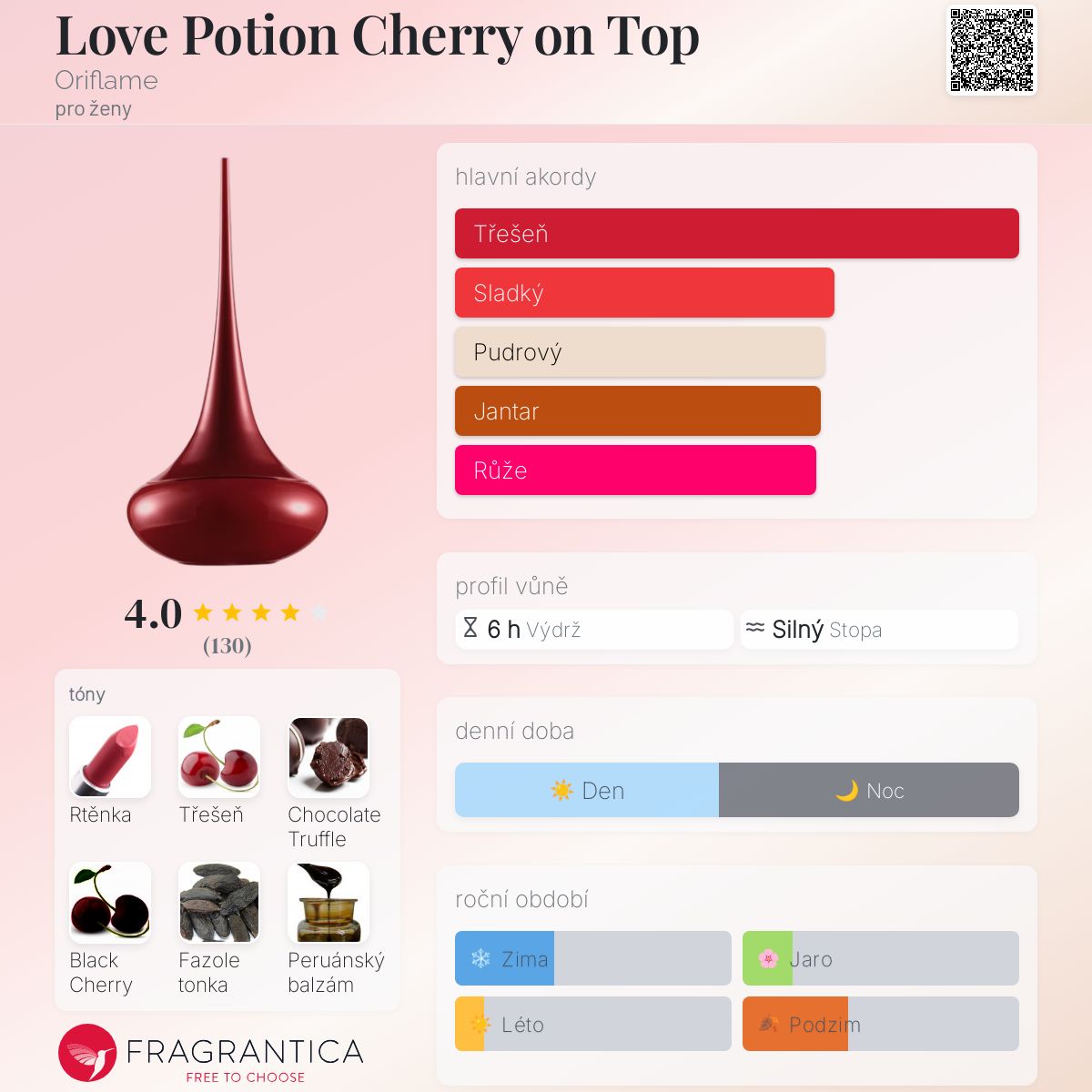 Love Potion Cherry on Top podle Oriflame je Floral Fruity Gourmand vůně pro ženy. Toto je nová vůně. Love Potion Cherry on Top byl/a uveden/a v roce 2025. Love Potion Cherry on Top byl/a vytvořen/a Louise Turner a Benoist Lapouza. Vrchní tóny jsou Rtěnka, Třešeň a Mandarinka; střední tóny jsouČerná třešeň, Peruánský balzám a Růže ; základní tóny jsou Čokoládový lanýž, Fazole tonka a Cedr.