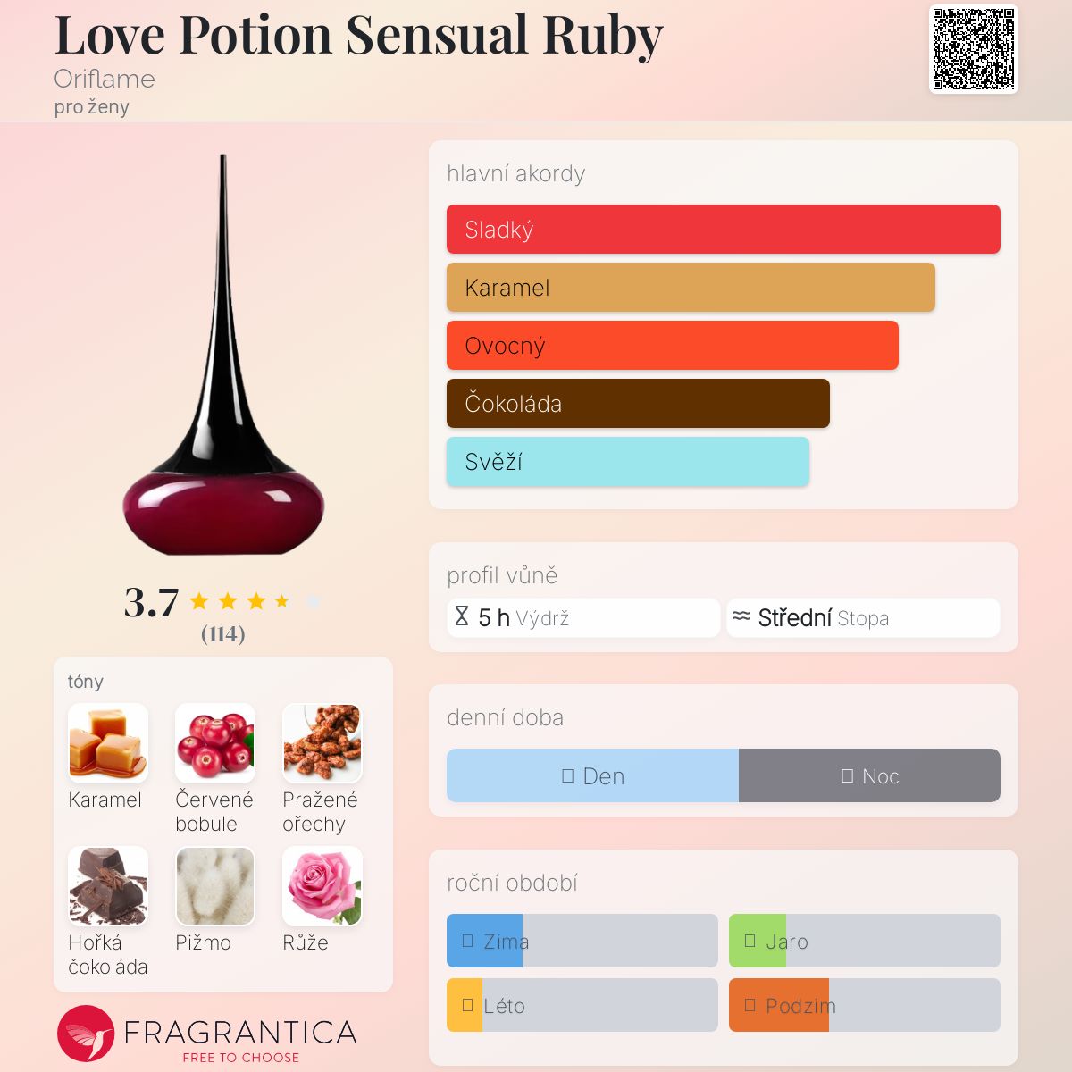 Love Potion Sensual Ruby podle Oriflame je vůně pro ženy. Love Potion Sensual Ruby byl/a uveden/a v roce 2023. "Nosem" za touto vůní je Benoist Lapouza. Vrchní tóny jsou Červené bobule, Pivoňka a Pomeranč; střední tóny jsouHořká čokoláda, Růže a Bílé květy ; základní tóny jsou Karamel, Pražené ořechy, Pižmo a Cedr.