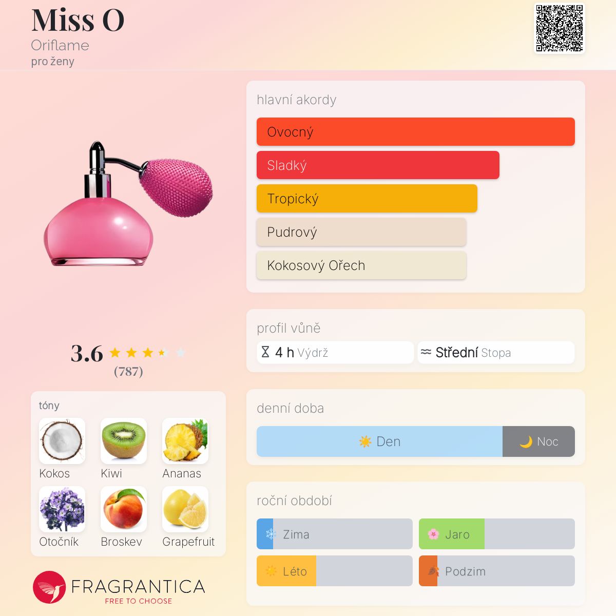 Miss O podle Oriflame je Floral Fruity vůně pro ženy. Miss O byl/a uveden/a v roce 2007. Vrchní tóny jsou Kiwi, Ananas, Grapefruit, Černý rybíz a Bergamot; střední tóny jsouKokosové mléko, Otočník, Broskev a Lilie ; základní tóny jsou Santalové dřevo, Pižmo, Jantar (ambra) a Cedr.