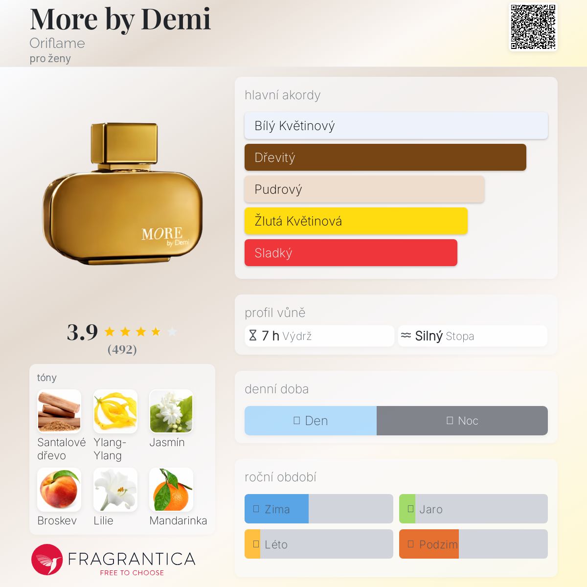 More by Demi podle Oriflame je Floral vůně pro ženy. More by Demi byl/a uveden/a v roce 2012. "Nosem" za touto vůní je Fabrice Pellegrin. Vrchní tóny jsou Bílá broskev, Zelená mandarinka a Otočník; střední tóny jsouYlang-Ylang, Jasmín a Pomerančový květ ; základní tóny jsou Santalové dřevo, Lilie a Pižmo.
