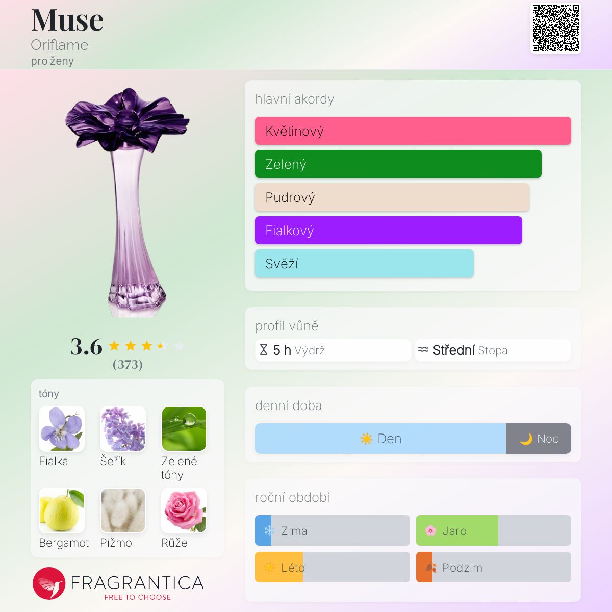 Muse podle Oriflame je Floral vůně pro ženy. Muse byl/a uveden/a v roce 2011. "Nosem" za touto vůní je Christian Vermorel. Vrchní tóny jsou Zelené tóny, Bergamot a Růžový pepř; střední tóny jsouFialka, Šeřík a Růže ; základní tóny jsou Pižmo, Santalové dřevo a Virginský cedr.