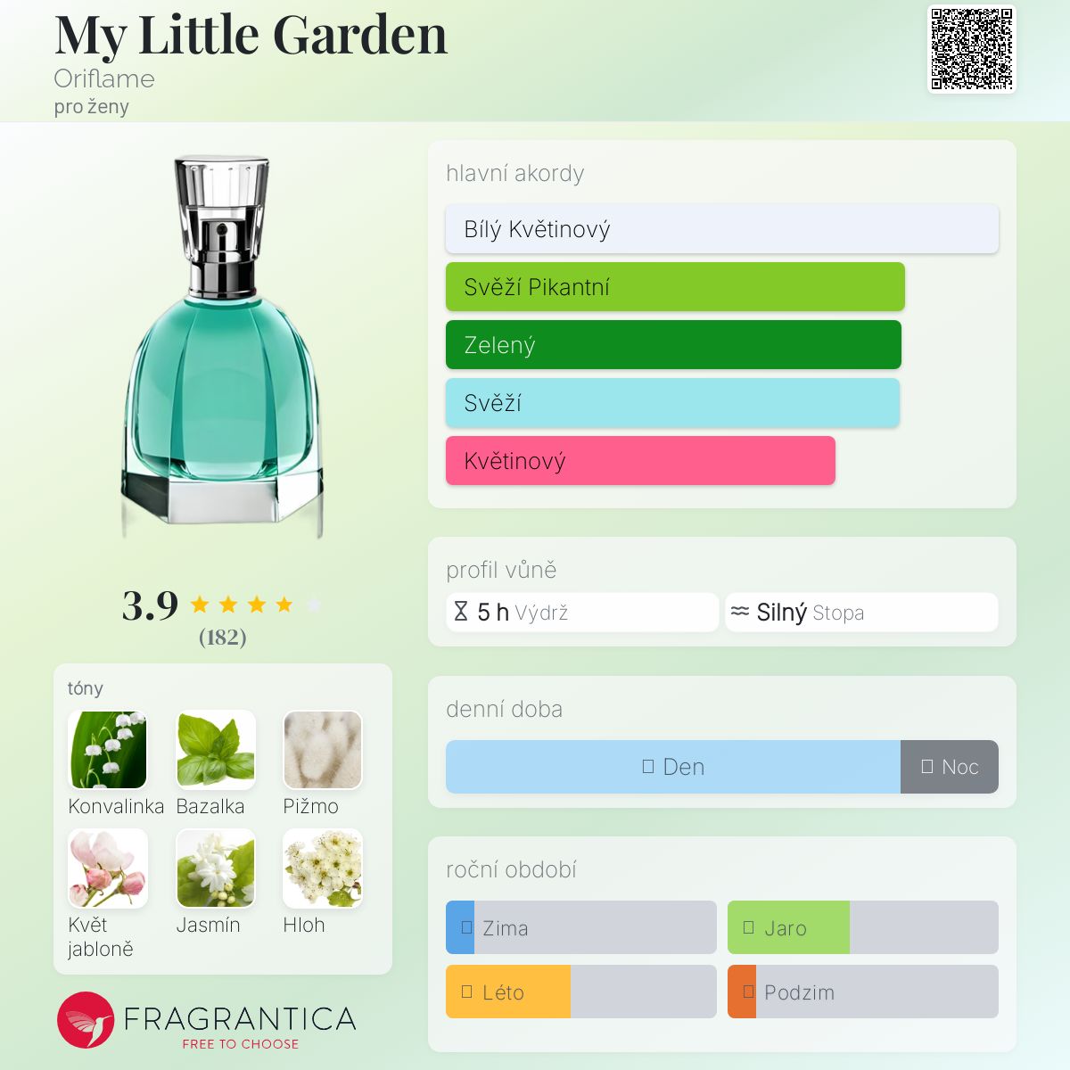 My Little Garden podle Oriflame je Floral vůně pro ženy. My Little Garden byl/a uveden/a v roce 2017. Vrchní tóny jsou Bazalka, Květ jabloně a Neroli; střední tóny jsouKonvalinka, Jasmín a Hloh ; základní tóny jsou Pižmo, Santalové dřevo a Cedr.