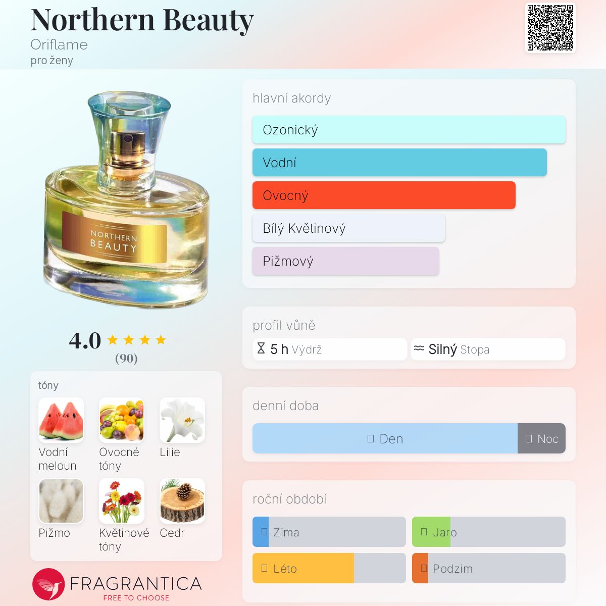 Northern Beauty podle Oriflame je Floral Aquatic vůně pro ženy. Northern Beauty byl/a uveden/a v roce 2017. Vrchní tóny jsou Vodní meloun a Květinové ovocné tóny; střední tóny jsouČervená lilie a Květinové tóny ; základní tóny jsou Bílé pižmo, Cedr a Jantar (ambra).