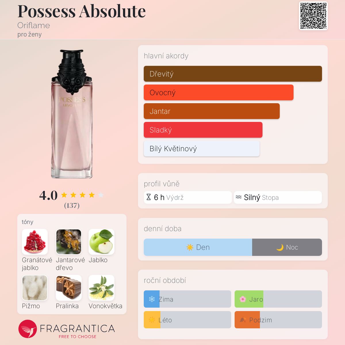 Possess Absolute podle Oriflame je vůně pro ženy. Possess Absolute byl/a uveden/a v roce 2022. Vrchní tóny jsou Granátové jablko, Jablko a Bergamot; střední tóny jsouVonokvětka, Pomerančový květ a Jasmín ; základní tóny jsou Jantarové dřevo, Pižmo a Pralinka.