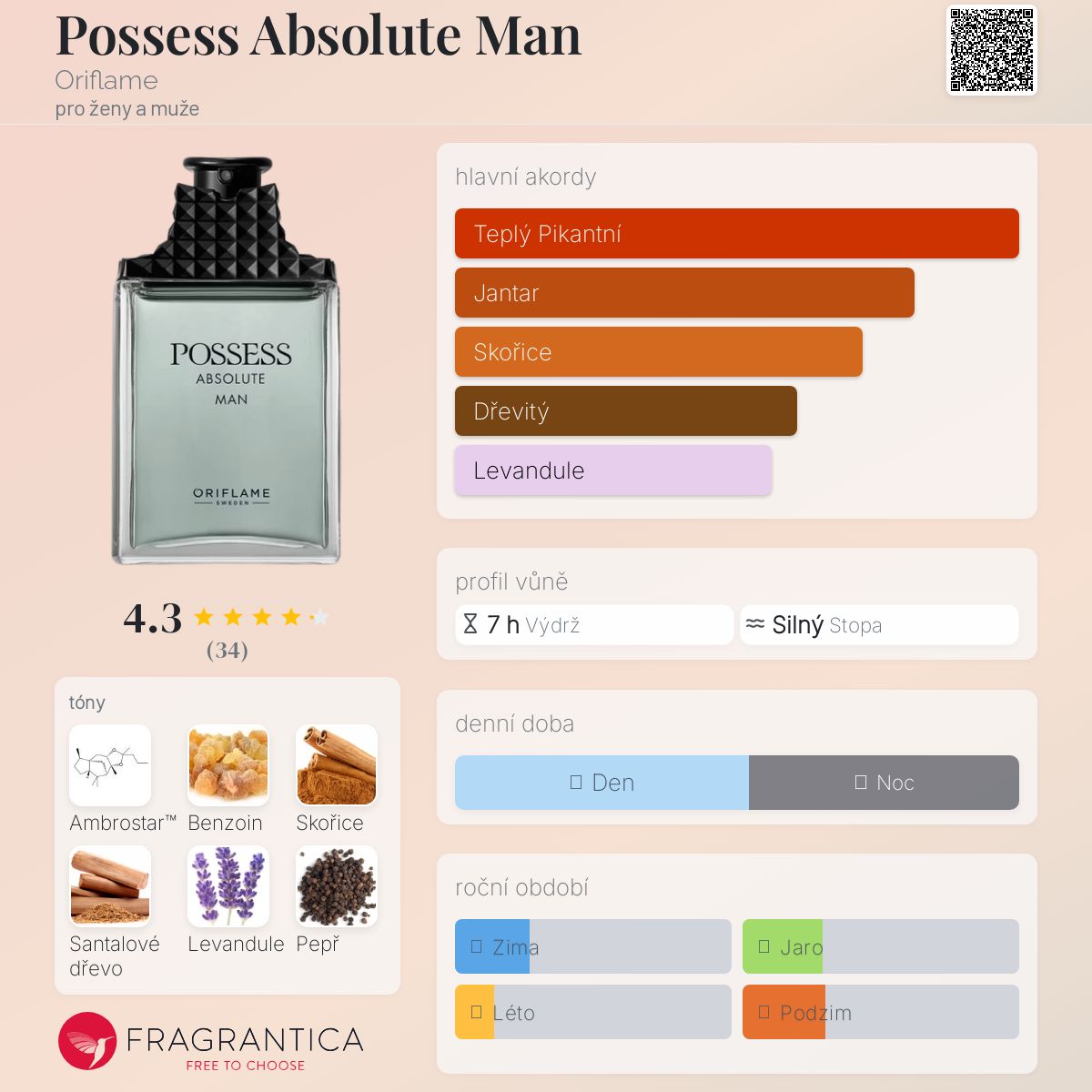 Possess Absolute Man podle Oriflame je Woody Spicy vůně pro ženy a muže. Possess Absolute Man byl/a uveden/a v roce 2023. Vrchní tóny jsou Černý pepř, Kardamom a Tymián; střední tóny jsouSkořice, Levandule a Pelargónie ; základní tóny jsou Ambrostar™, Benzoin a Santalové dřevo.