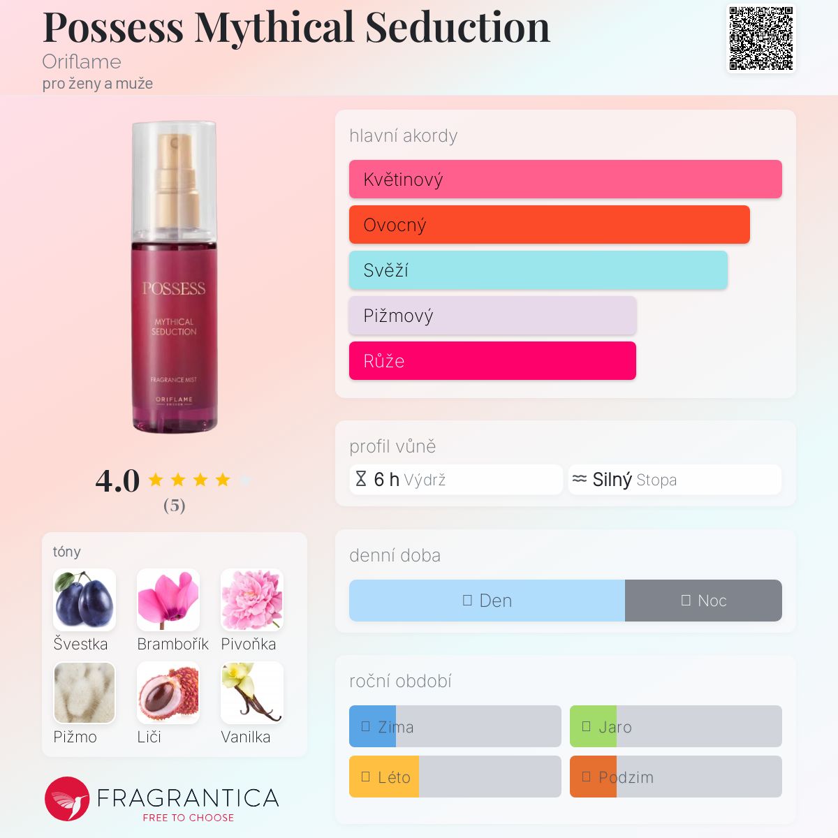 Possess Mythical Seduction podle Oriflame je vůně pro ženy a muže. Toto je nová vůně. Possess Mythical Seduction byl/a uveden/a v roce 2025. Vrchní tóny jsou Švestka, Liči a Mandarinka; střední tóny jsouBrambořík, Pivoňka a Růže ; základní tóny jsou Pižmo, Vanilka a Cedr.
