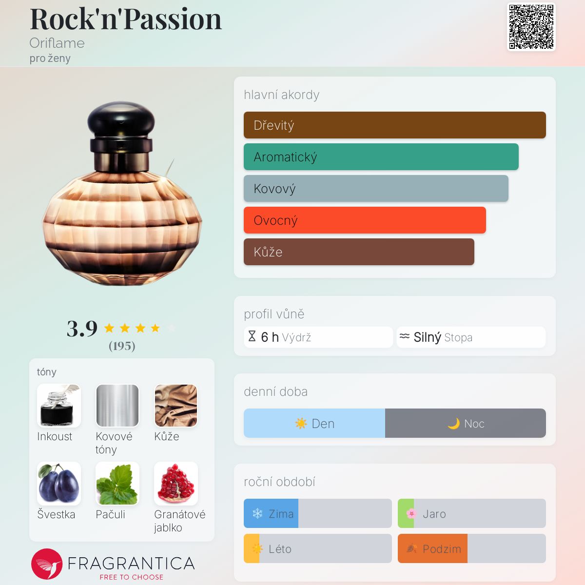 Rock'n'Passion podle Oriflame je Orientální Woody vůně pro ženy. Rock'n'Passion byl/a uveden/a v roce 2012. "Nosem" za touto vůní je Nathalie Feisthauer. Vrchní tóny jsou Kovové tóny, Granátové jablko a Pomerančový květ; střední tóny jsouInkoust, Kůže a Švestka ; základní tóny jsou Pačuli, Fazole tonka a Pižmo.