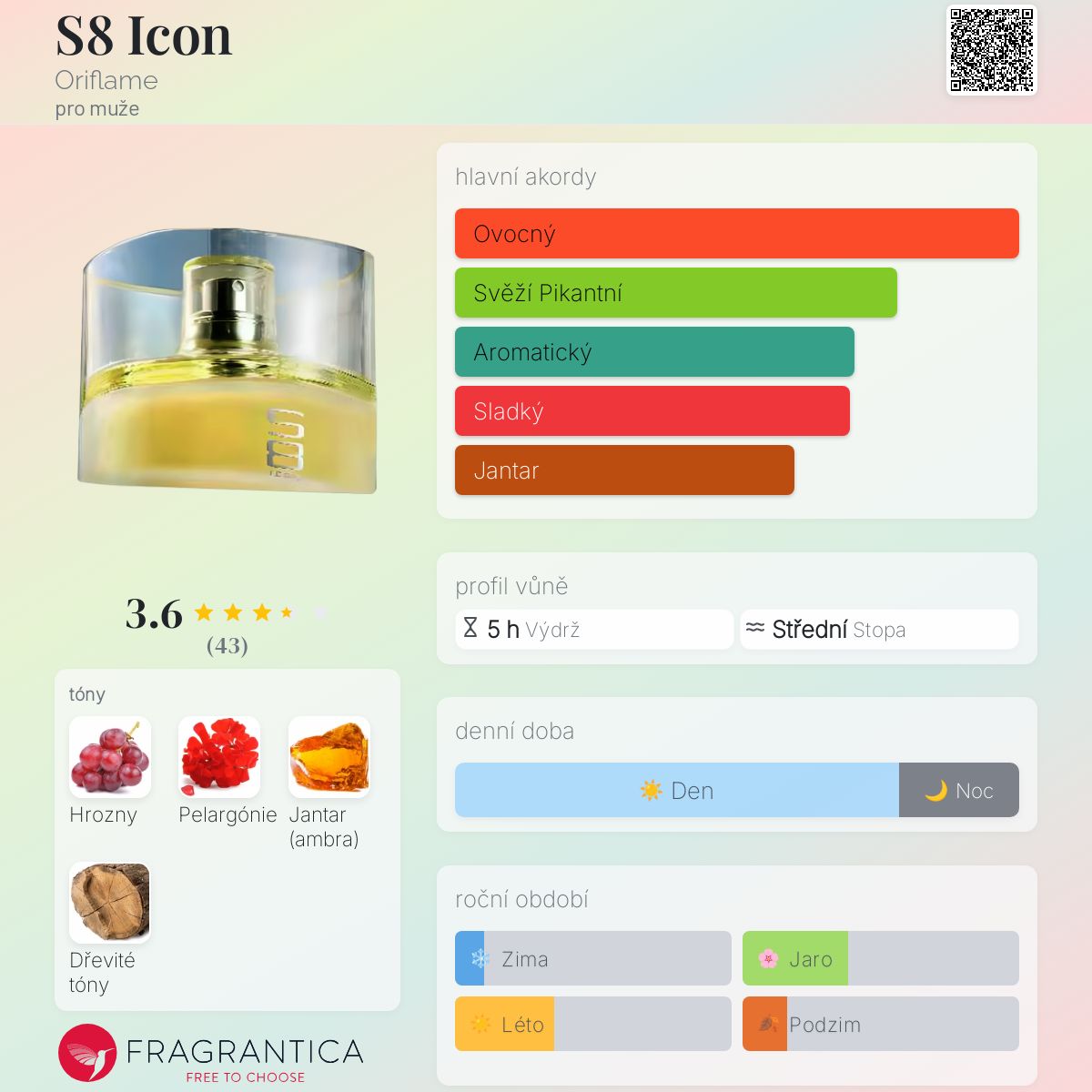 S8 Icon podle Oriflame je Aromatic vůně pro muže. S8 Icon byl/a uveden/a v roce 2016. Vrchní tón je Hrozny ; střední tón jePelargónie ; základní tóny jsou Jantar (ambra) a Dřevité tóny.
