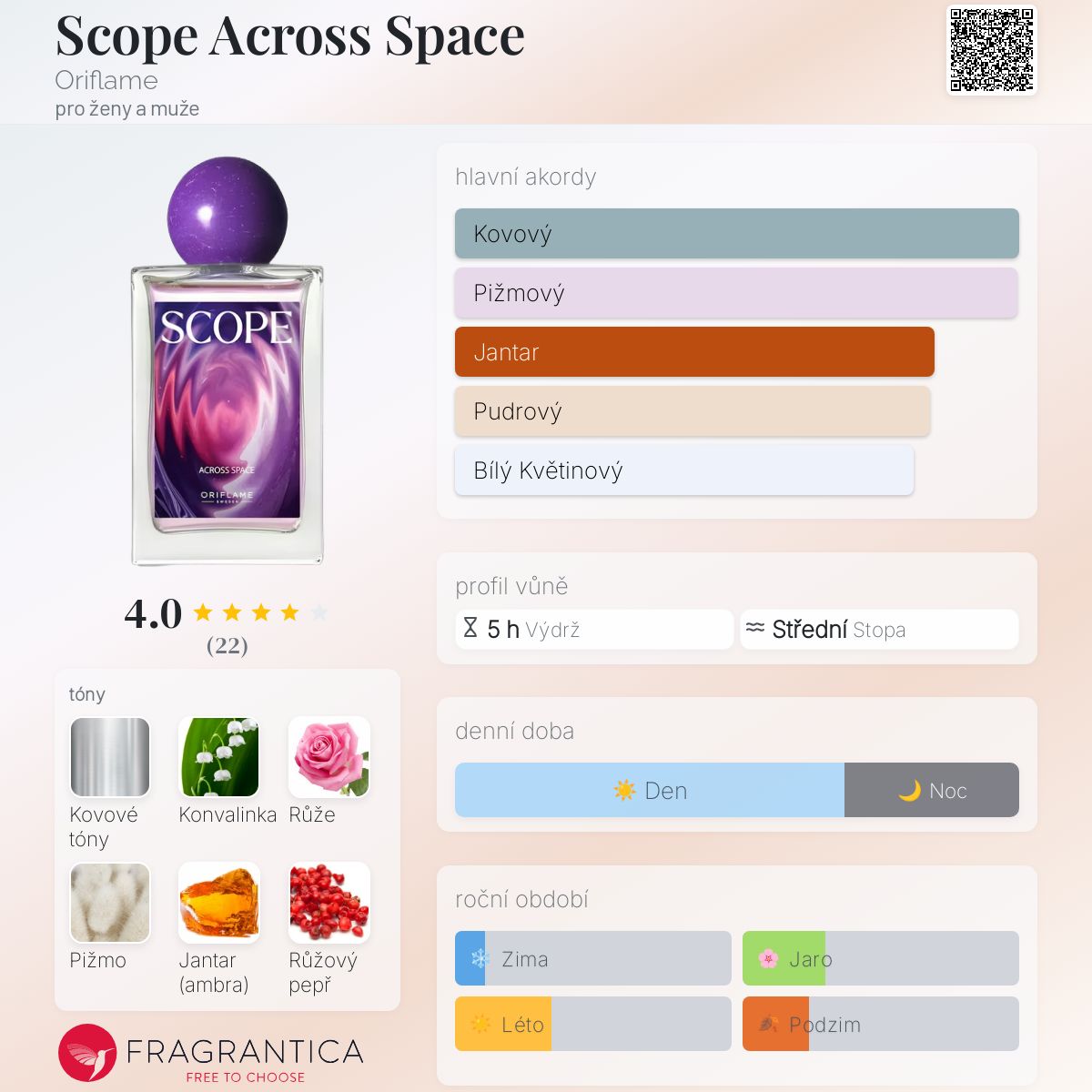 Scope Across Space podle Oriflame je Aromatic vůně pro ženy a muže. Toto je nová vůně. Scope Across Space byl/a uveden/a v roce 2024. "Nosem" za touto vůní je Alexandra Carlin. Vrchní tóny jsou Konvalinka, Růžový pepř a Zázvor; střední tóny jsouRůže, Ylang-Ylang, Orris a Samet ; základní tóny jsou Kovové tóny, Pižmo, Jantar (ambra) a Labdanum.