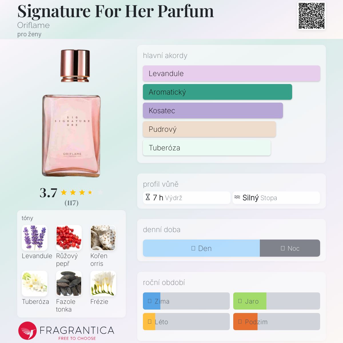Signature For Her Parfum podle Oriflame je Orientální Floral vůně pro ženy. Signature For Her Parfum byl/a uveden/a v roce 2021. Signature For Her Parfum byl/a vytvořen/a Olivier Cresp a Sébastien Cresp. Vrchní tóny jsou Růžový pepř, Rebarbora a Růžový grapefruit; střední tóny jsouLevandule, Orris, Tuberóza a Frézie ; základní tóny jsou Fazole tonka, Santalové dřevo a Jantar (ambra).