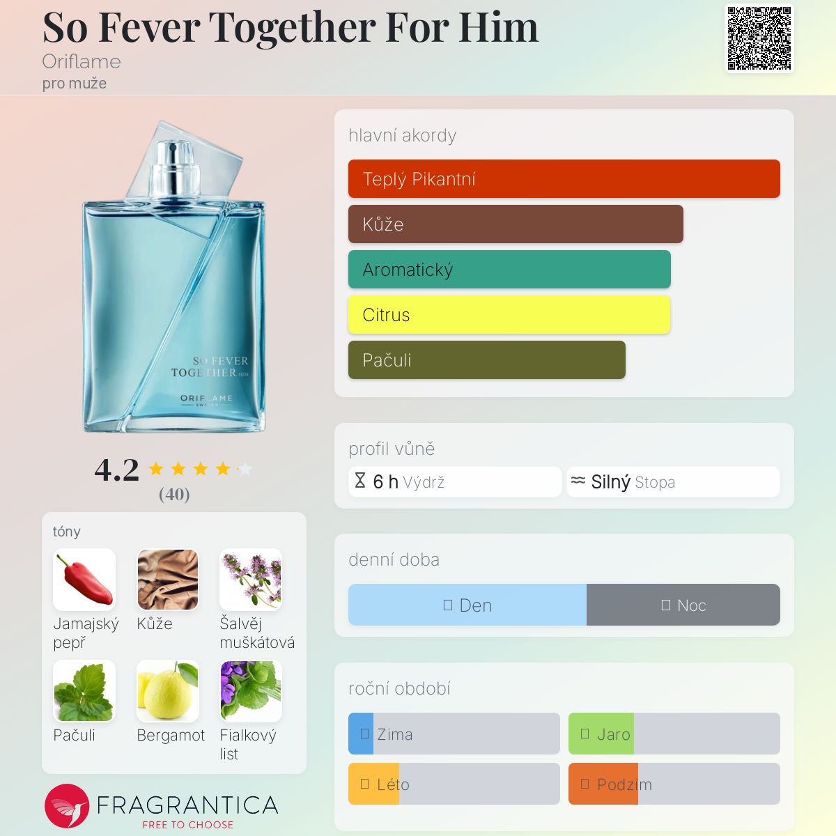 So Fever Together For Him podle Oriflame je Woody Spicy vůně pro muže. So Fever Together For Him byl/a uveden/a v roce 2019. Vrchní tóny jsou Bergamot, Fialkové listy a Mandarinka; střední tóny jsouSladká paprika, Šalvěj muškátová a Skořice ; základní tóny jsou Kůže, Pačuli a Labdanum.