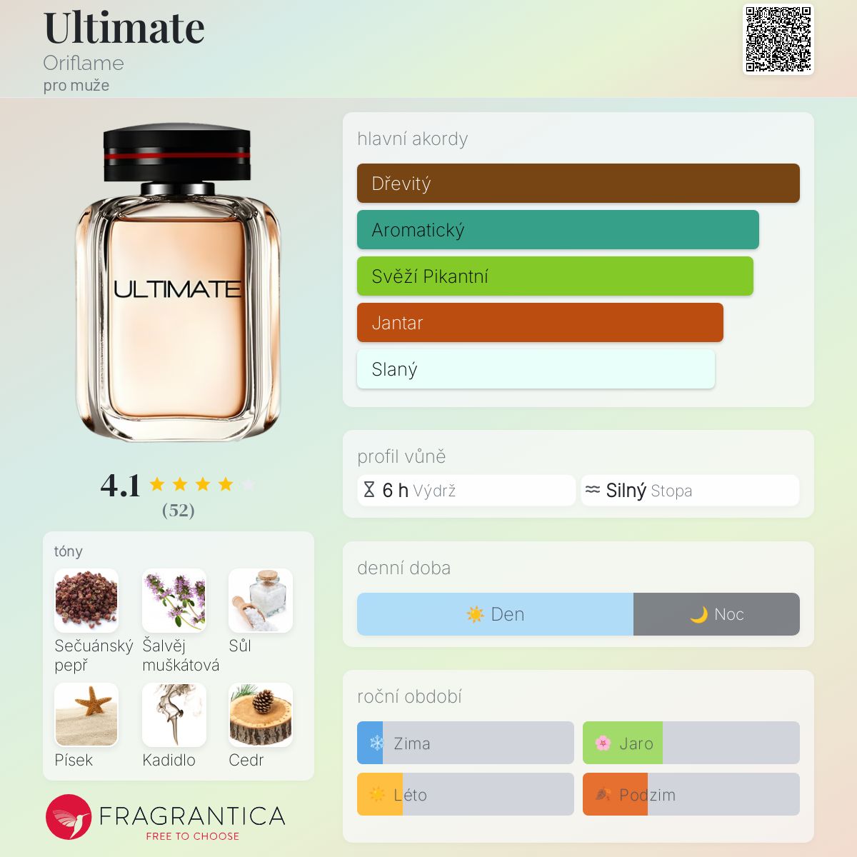 Ultimate podle Oriflame je Woody Spicy vůně pro muže. Ultimate byl/a uveden/a v roce 2014. Ultimate byl/a vytvořen/a Alexis Dadier a Alexandra Carlin. Vrchní tóny jsou Sečuánský pepř, Šalvěj muškátová a Sůl; střední tóny jsouPísek, Kadidlo a Pačuli ; základní tóny jsou Cedr, Santalové dřevo a Jantar (ambra).