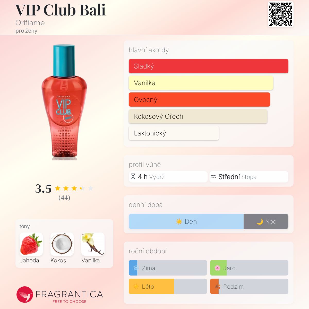 VIP Club Bali podle Oriflame je Orientální Vanilla vůně pro ženy. VIP Club Bali byl/a uveden/a v roce 2017. Vrchní tón je Jahoda ; střední tón jeKokosový nektar ; základní tón je Vanilka.