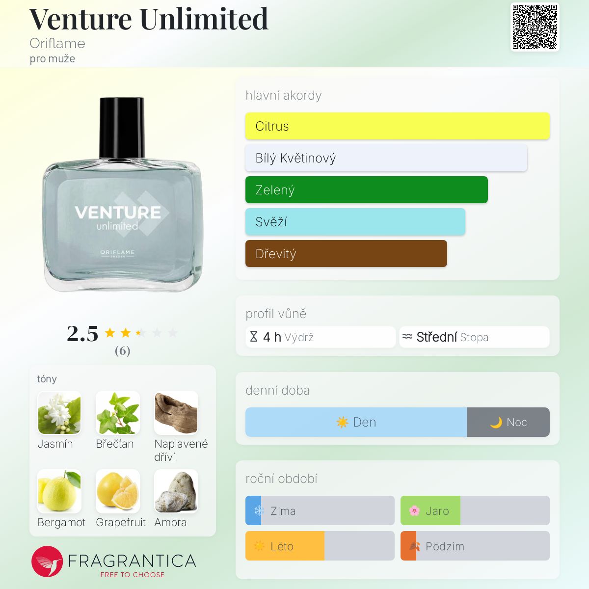 Venture Unlimited podle Oriflame je Aromatic vůně pro muže. Venture Unlimited byl/a uveden/a v roce 2023. "Nosem" za touto vůní je Suzy Le Helley. Vrchní tóny jsou Břečťan, Bergamot a Grapefruit; střední tóny jsouVodní jasmín, Naplavené dříví a Bambus ; základní tóny jsou Ambra, Cedr a Pačuli.