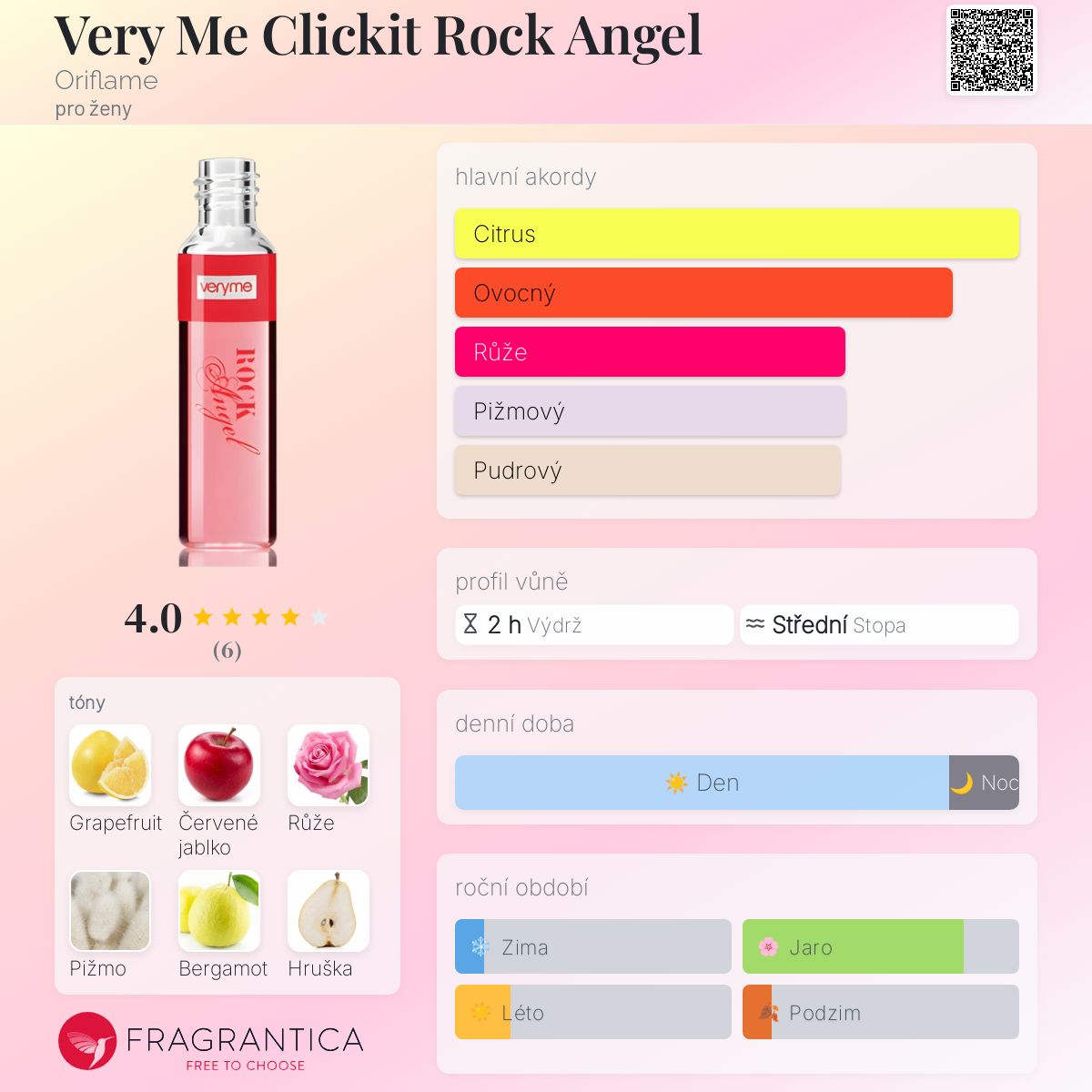Very Me Clickit Rock Angel podle Oriflame je Floral Fruity Gourmand vůně pro ženy. Very Me Clickit Rock Angel byl/a uveden/a v roce 2012. Vrchní tóny jsou Grapefruit, Červené jablko, Bergamot a Hruška; střední tóny jsouRůže, Tuberóza, Fialka, Broskev a Gardénie ; základní tóny jsou Pižmo, Santalové dřevo, Virginský cedr, Pralinka, Vanilka a Pačuli.